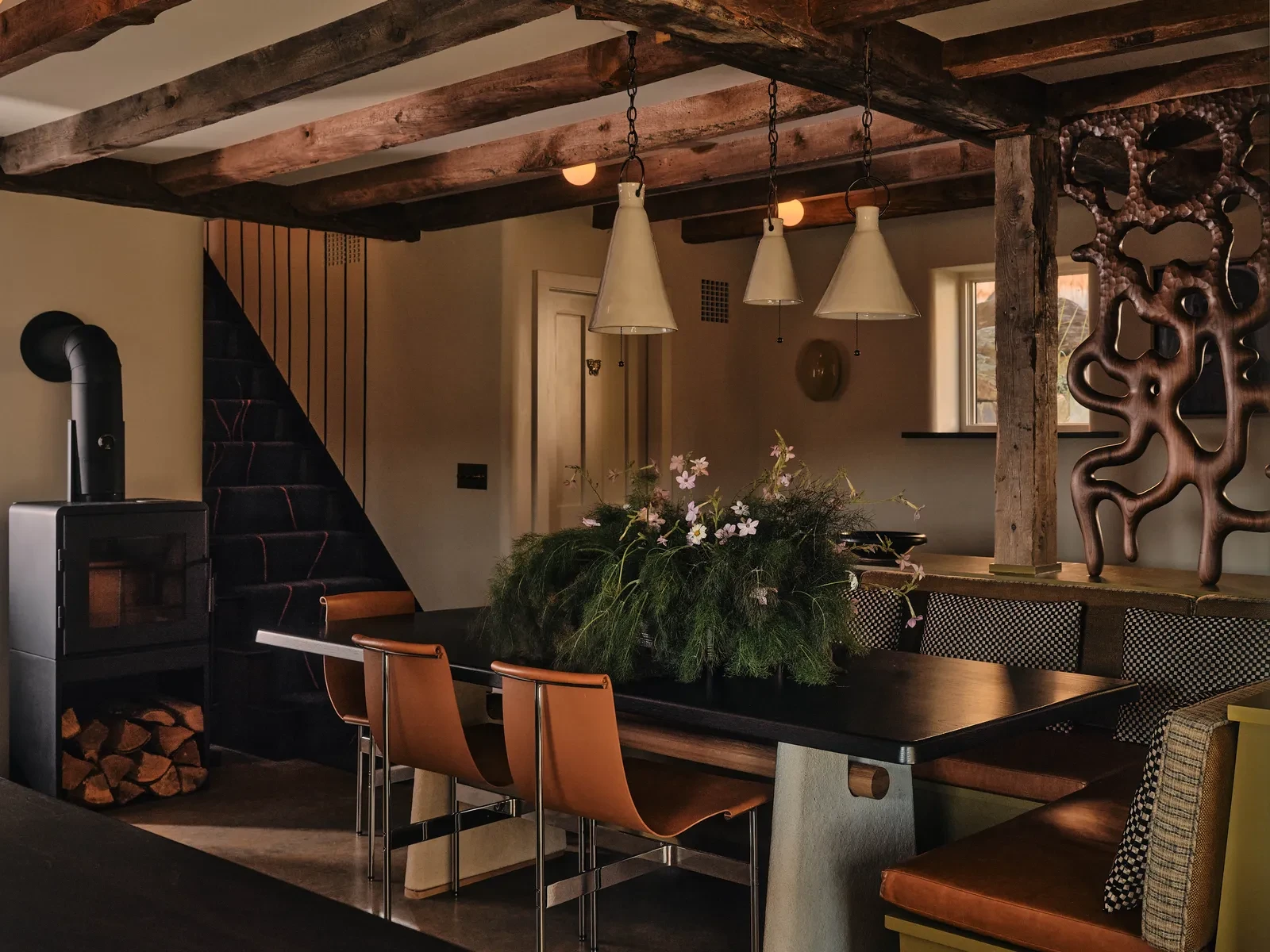 Απέναντι από την κουζίνα δημιουργήθηκε μια τραπεζαρία με ενσωματωμένο ένα γωνιακό παγκάκι από την Trio Furniture, το οποίο αγκαλιάζει το τραπέζι και δημιουργεί έναν άνετο χώρο. Οι καρέκλες από τη Gratz Industries συμπληρώνουν τη σύνθεση, ενώ τα κεραμικά φωτιστικά από το NPage Studio που κρέμονται από την οροφή, προσθέτουν μια ζεστή και χειροποίητη αίσθηση στον χώρο.