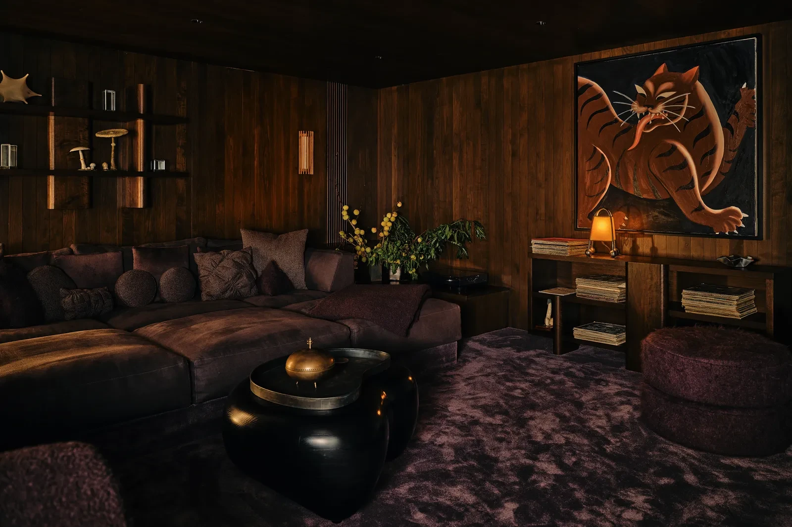 Πέρα από τους χώρους φιλοξενίας, το παλιό σχολείο διέθετε και ένα μεγάλο studio για τις καλλιτεχνικές εργασίες. Το συγκεκριμένο δωμάτιο μετατράπηκε σε αποθηκευτικό χώρο για καλλιτεχνικά υλικά και ντύθηκε με vintage έπιπλα, τα οποία δίνουν χαρακτήρα στον χώρο, όπως ένα παλιό μεταλλικό μπαούλο με ζωηρά διακοσμητικά μοτίβα. Επίσης, στο χαμηλότερο επίπεδο του κτιρίου δημιουργήθηκε ένας χώρος προβολών, όπου οι custom καναπέδες σε βαθιές αποχρώσεις του μωβ και τα μαξιλάρια δημιουργούν μια πιο σκοτεινή και κινηματογραφική ατμόσφαιρα.