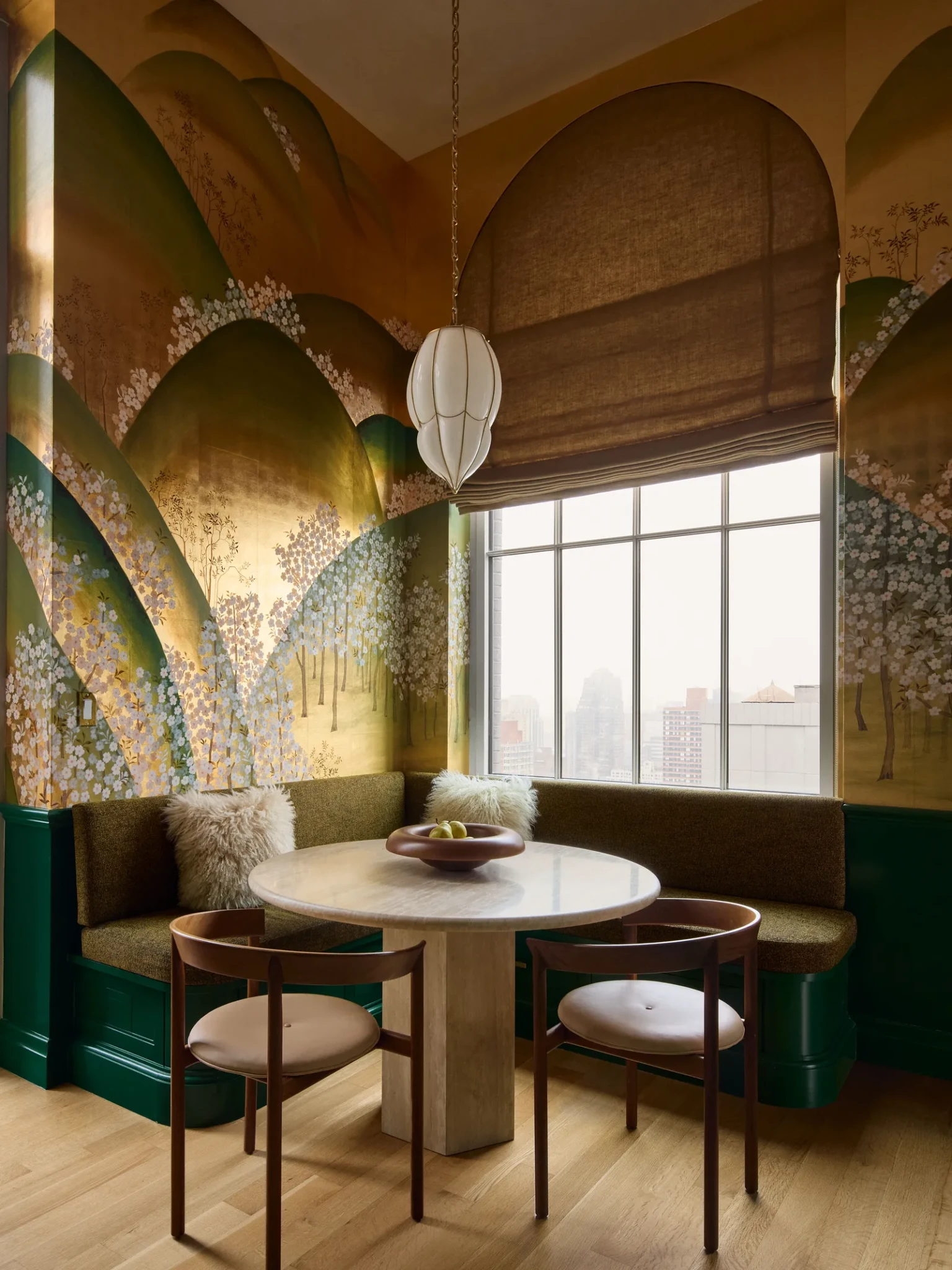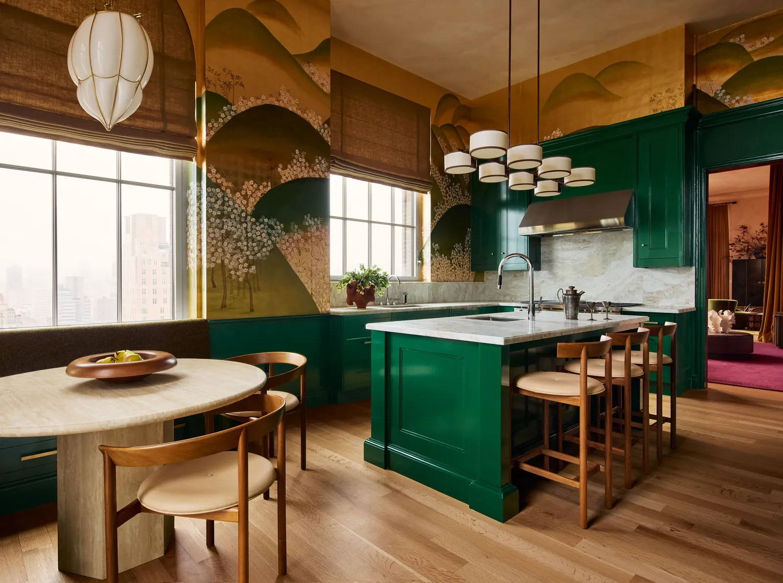 Η κουζίνα ακολουθεί μια εντελώς διαφορετική χρωματική προσέγγιση. Τα ντουλάπια βάφτηκαν σε έντονη πράσινη απόχρωση, ενώ οι τοίχοι καλύφθηκαν με μια εντυπωσιακή ταπετσαρία της de Gournay, η οποία προσθέτει μια σχεδόν θεατρική διάσταση στον χώρο. Η κουζίνα λειτουργεί ως πραγματική καρδιά του σπιτιού, καθώς εκεί συγκεντρώνεται η οικογένεια για τα καθημερινά της γεύματα. Γύρω από το τραπέζι τοποθετήθηκαν καρέκλες του Michael Anastassiades για την Herman Miller, οι οποίες προσθέτουν μια μινιμαλιστική και σύγχρονη πινελιά στο δωμάτιο.