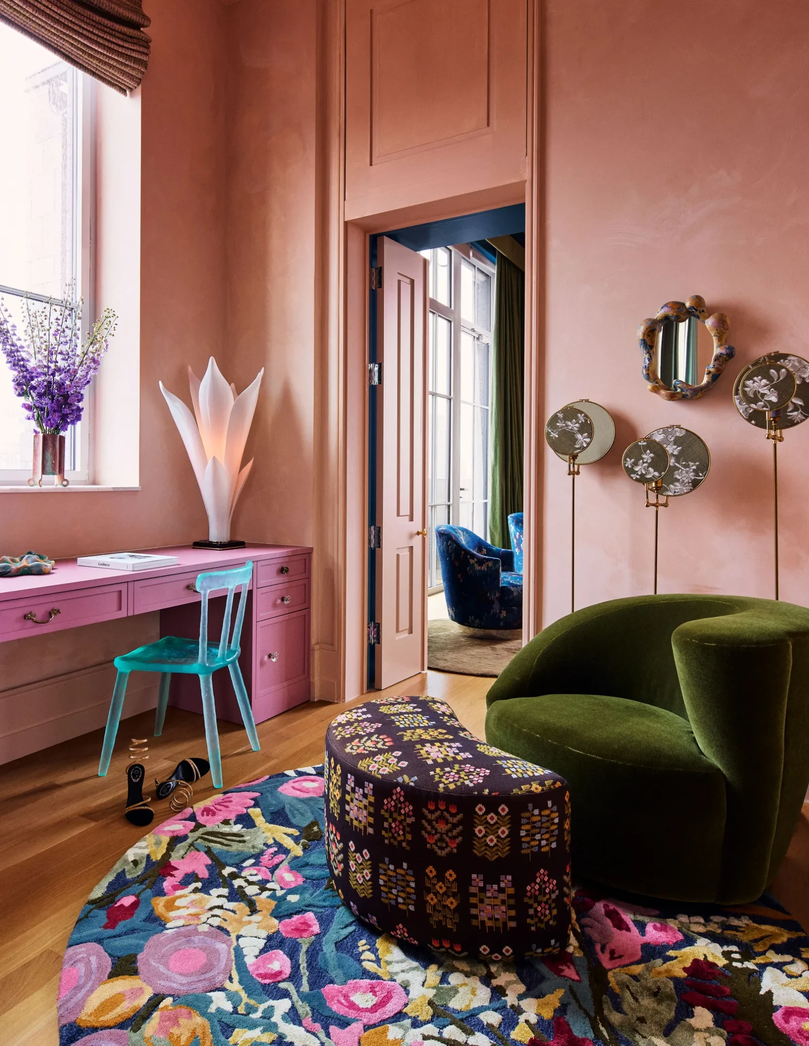 Η αντίθεση ανάμεσα στο ροζ σαλόνι και την πράσινη κουζίνα δημιουργεί μια δυναμική χρωματική αφήγηση που επαναλαμβάνεται σε όλο το σπίτι.