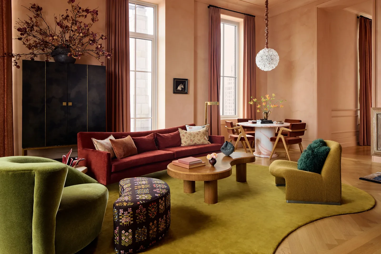 Στο σαλόνι συνυπάρχουν vintage και σύγχρονα κομμάτια όπως ένας καναπές σχεδιασμένος από τον Paul McCobb από τη δεκαετία του 1950, μια περιστρεφόμενη πολυθρόνα του Vladimir Kagan και μια lounge καρέκλα του Giancarlo Piretti από τη δεκαετία του 1970. Ένα custom χαλί της Stark ολοκληρώνει τη σύνθεση, δημιουργώντας έναν χώρο που συνδυάζει άνεση και design.