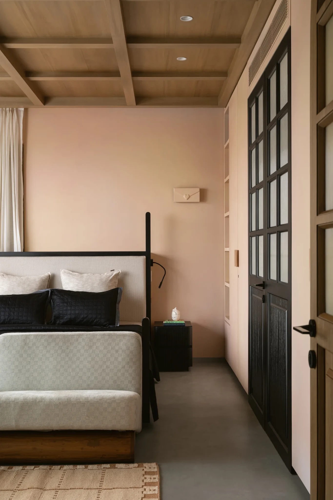 Στο παιδικό δωμάτιο το κρεβάτι αποτελεί το κεντρικό στοιχείο του χώρου, ενώ το ξύλινο ταβάνι και το καμπυλωτό παράθυρο πλαισιώνουν αρμονικά τη θέα στο δέντρο Champa. Το μπάνιο και ο πάγκος του ντύνονται από ροδακινί, ανάγλυφα πλακάκια και έρχονται σε αντίθεση με το υπόλοιπο σπίτι, ενώ η επιτοίχια λάμπα σε σχήμα καρδιάς θυμίζει σε σχεδιασμό και εναρμονίζεται με αυτό που βρίσκεται στο μπάνιο.