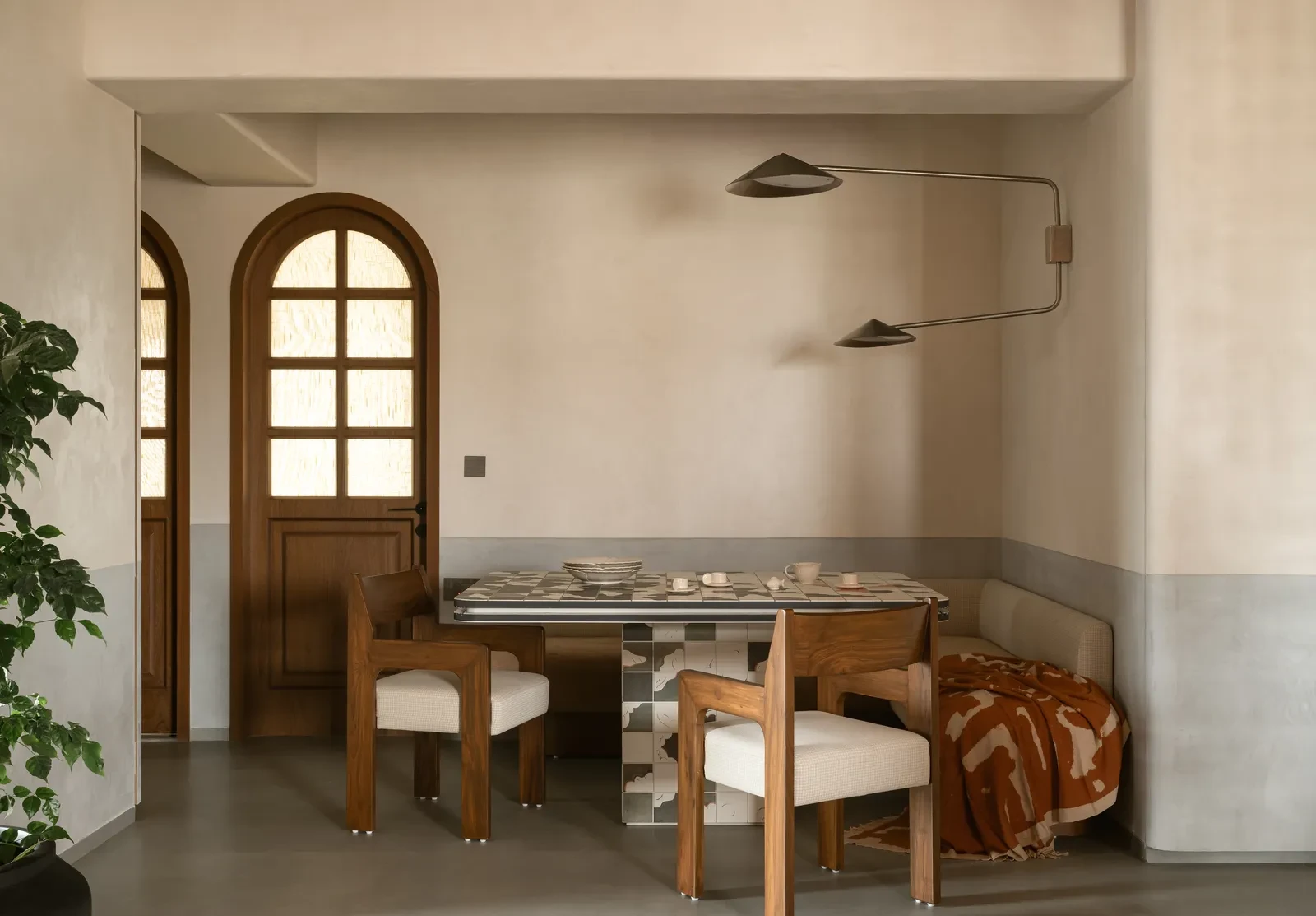 Από την άλλη μεριά της κατοικίας, την πιο νεανική, οι ευθείες γραμμές αντικαθιστώνται με καμπύλες και η μπεζ απόχρωση μετατρέπεται σε μια πολύχρωμη αλλά ήπια παλέτα. Η παιχνιδιάρικη διάθεση αποτυπώνεται από τα ζωγραφισμένα στο χέρι πλακάκια σε kumo μοτίβο, ένα παραδοσιακό ιαπωνικό σχέδιο για τα σύννεφα. Πιο πέρα, ένα μπαρ με χρωματικά μπλοκ εκτείνεται σε ένα μικρό μπαλκόνι με κεντρικό στολίδι ένα δέντρο Champa.