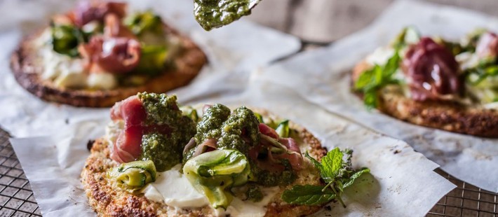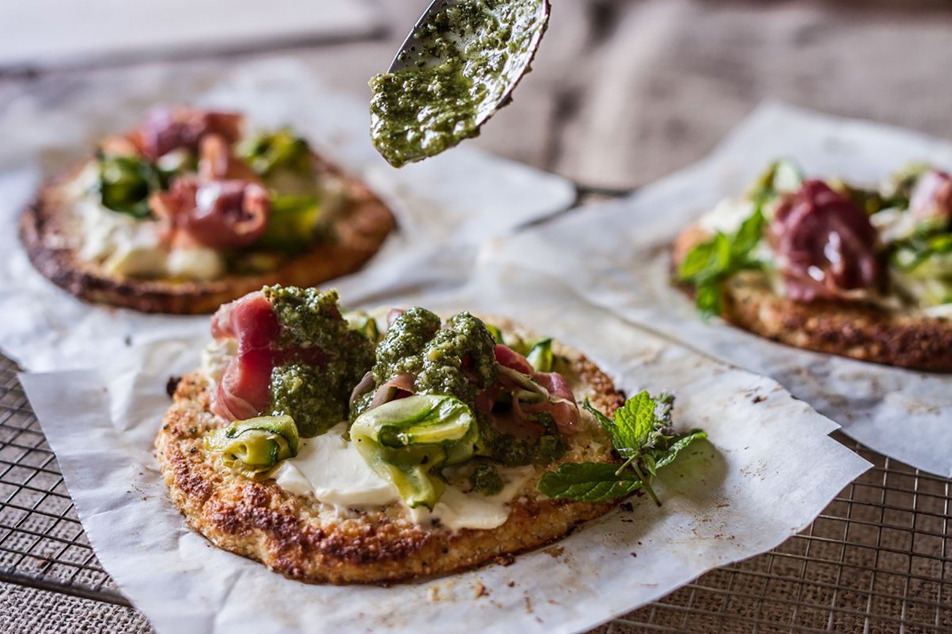 - ΕΚΤΕΛΕΣΗ: Προθερμαίνετε τον φούρνο στους 180°C στον αέρα και τοποθετείτε μέσα δύο μεγάλα ταψιά για να ζεσταθούν, από την ανάποδη, όμως, πλευρά. Με ένα μαχαίρι κόβετε μπουκετάκια το κουνουπίδι, χωρίς να βάλετε το μεγάλο κοτσάνι. Έπειτα τα χτυπάτε στο πολυμηχάνημα με τα μαχαίρια μέχρι να μοιάσουν με κουσκούς και τα τοποθετείτε μέσα σε ένα μπολ. Χτυπάτε ελαφρώς τα αυγά και τα προσθέτετε στο μπολ με το κουνουπίδι. Έπειτα ρίχνετε τα αλεσμένα αμύγδαλα και την τριμμένη παρμεζάνα. Αλατοπιπερώνετε και ανακατεύετε το μείγμα με τα χέρια, μέχρι να ομογενοποιηθεί. Τοποθετείτε δύο μεγάλες λαδόκολλες στον πάγκο εργασίας. Χωρίζετε το μείγμα κουνουπιδιού στα τέσσερα και σε κάθε λαδόκολλα απλώνετε δύο μερίδες του μείγματος και σχηματίζετε λεπτούς κύκλους. Προσεχτικά τοποθετείτε τις λαδόκολλες με τις βάσεις της πίτσας στα ταψιά που έχετε βάλει στον φούρνο να ζεσταθούν. Ψήνετε για 20 λεπτά ή μέχρι να πάρουν ένα βαθύ χρυσαφί χρώμα και να σταθεροποιηθούν.