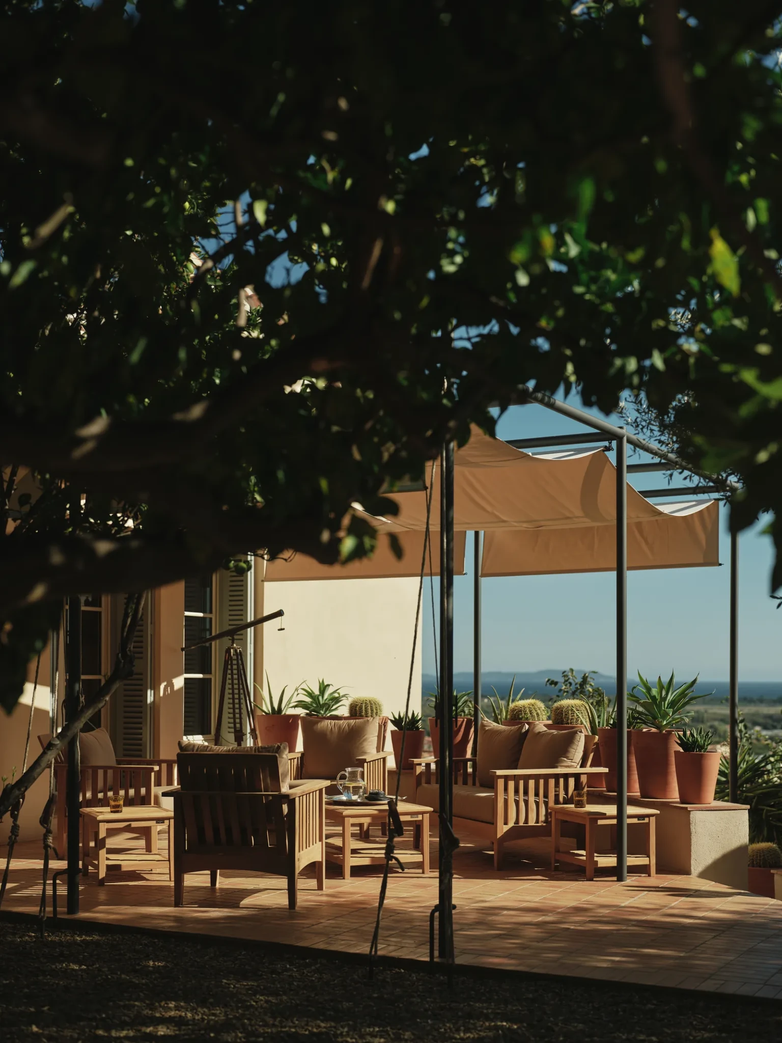 Ο εξωτερικός χώρος αποτελεί αναπόσπαστο κομμάτι της εμπειρίας της κατοίκησης. Ο κήπος, σχεδιασμένος σε συνεργασία με ειδικούς designers, περιβάλλεται από τείχη μεσαιωνικού στιλ και φιλοξενεί δέντρα με φρούτα όπως λεμόνια, ρόδια και σύκα. Οι εξωτερικές κουρτίνες και ο φωτισμός δημιουργούν μια ατμόσφαιρα που αλλάζει κατά τη διάρκεια της ημέρας, ενώ οι χώροι του καθιστικού και της τραπεζαρίας ενθαρρύνουν τη ζωή στο εξωτερικό περιβάλλον. Με αυτόν τον τρόπο η κατοικία λειτουργεί ως ένα ολοκληρωμένο σκηνικό καθημερινότητας, όπου η φύση και η αρχιτεκτονική συνυπάρχουν αρμονικά.