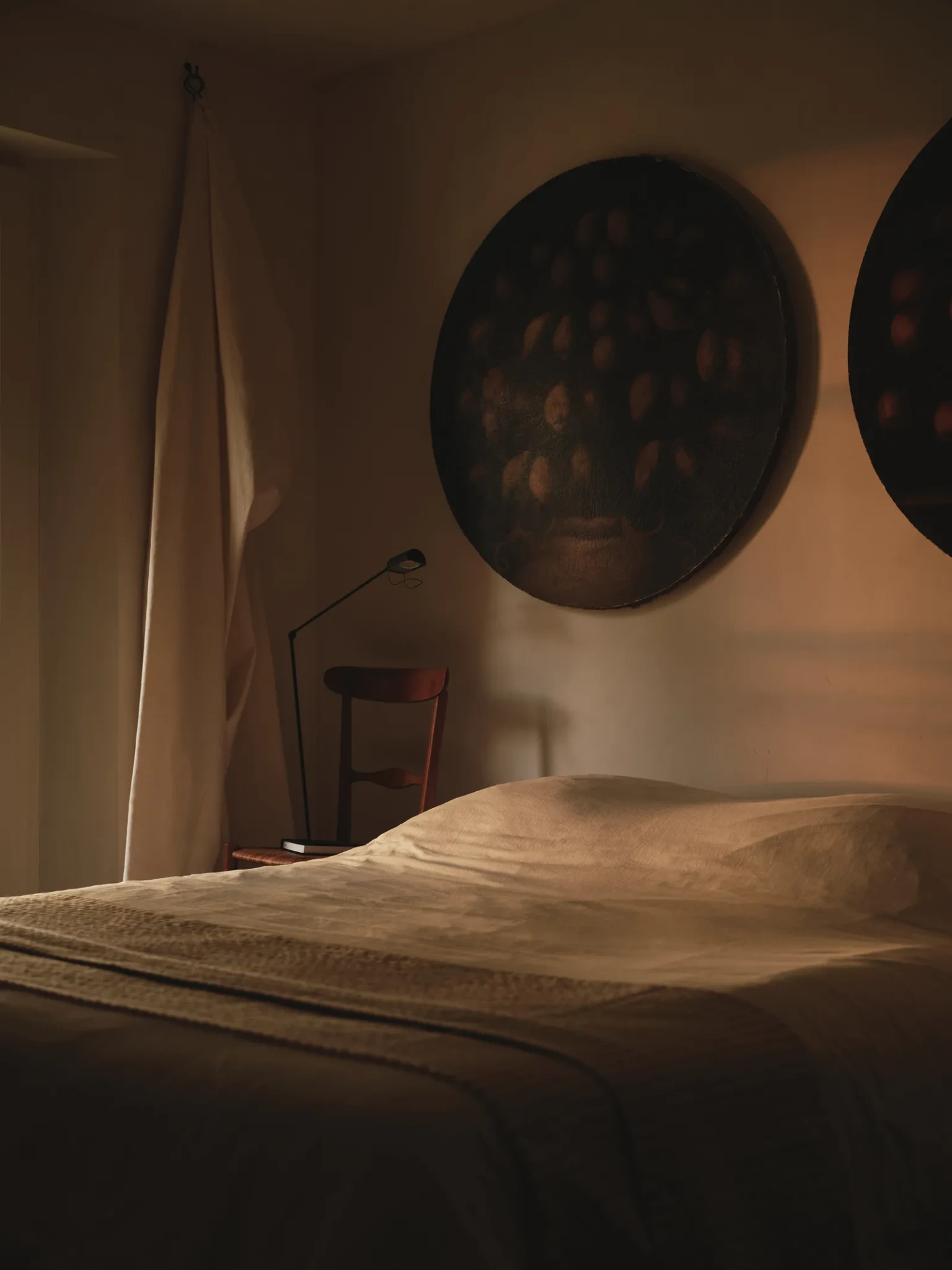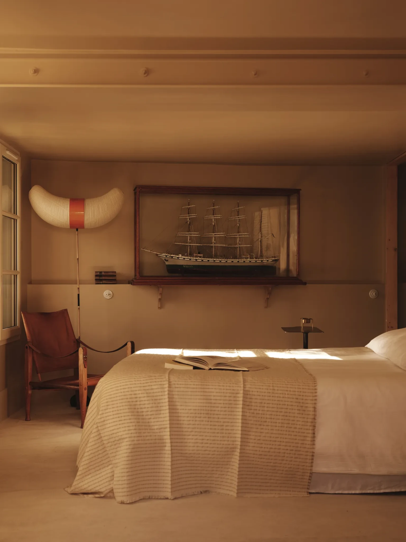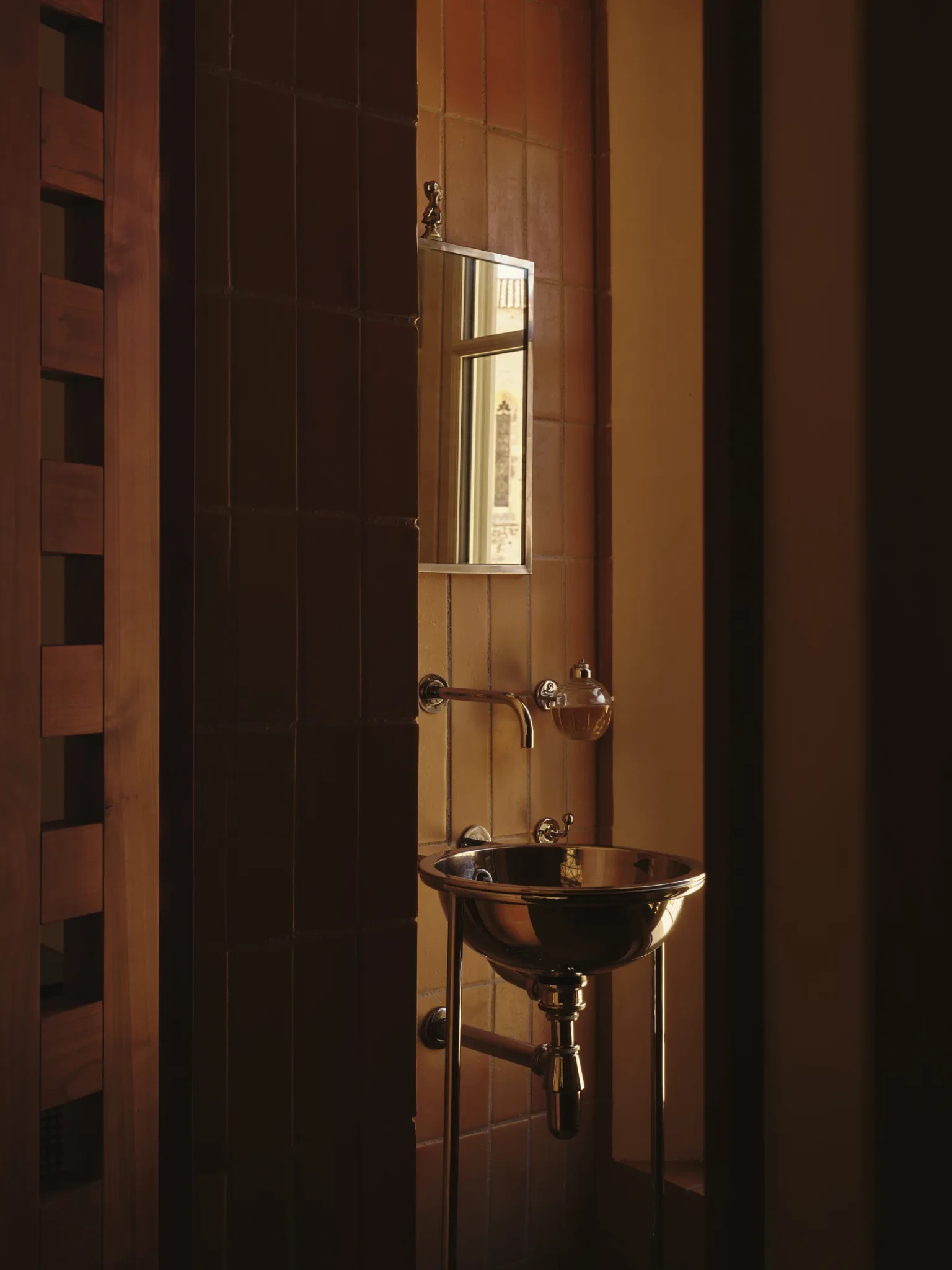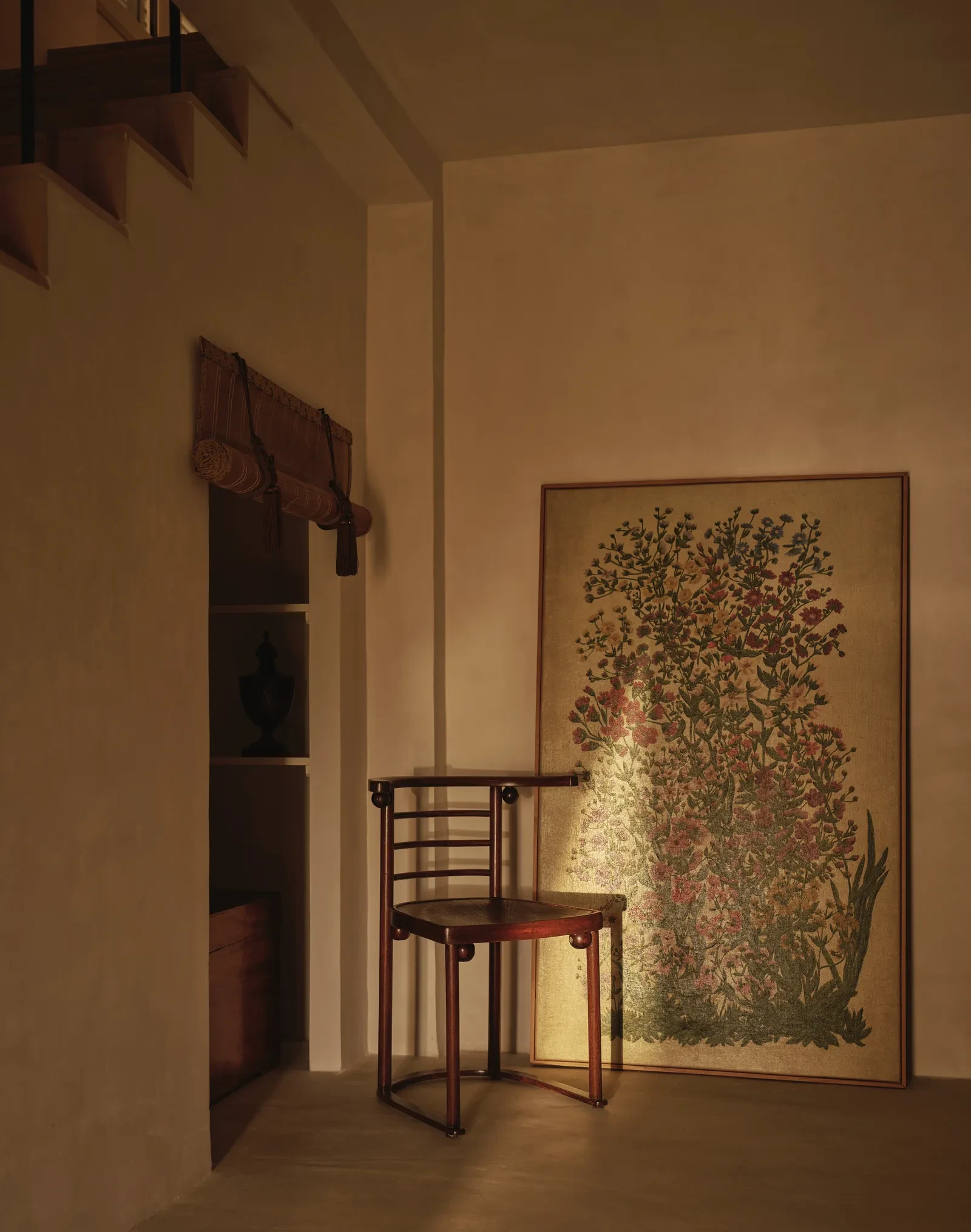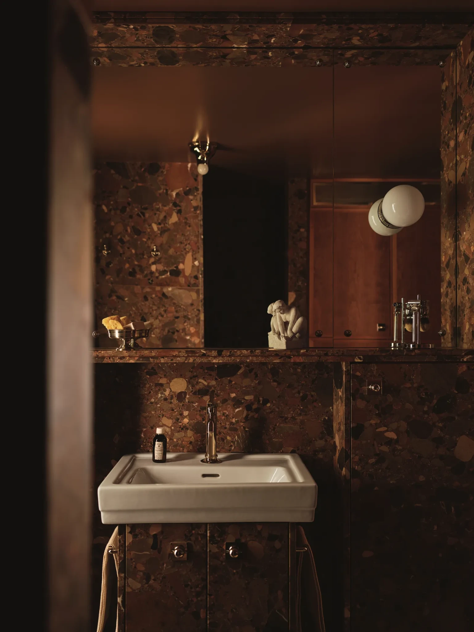 Στους πιο ιδιωτικούς χώρους, η αισθητική παραμένει συνεπής αλλά παράλληλα πιο ήπια. Στο dressing room κυριαρχεί το ξύλο κερασιάς, ενώ τα δάπεδα σε έντονες αποχρώσεις προσθέτουν βάθος στον χώρο. Οι λεπτομέρειες, όπως τα χερούλια εμπνευσμένα από το Bauhaus κύμα και οι χειρολαβές που παραπέμπουν στον μοντερνισμό του 20ού αιώνα, αποκαλύπτουν τη βαθιά έρευνα που πραγματοποιήθηκε πίσω από τον σχεδιασμό. Κάθε στοιχείο φαίνεται επιλεγμένο με πρόθεση, ενισχύοντας τη συνολική αφήγηση του χώρου.