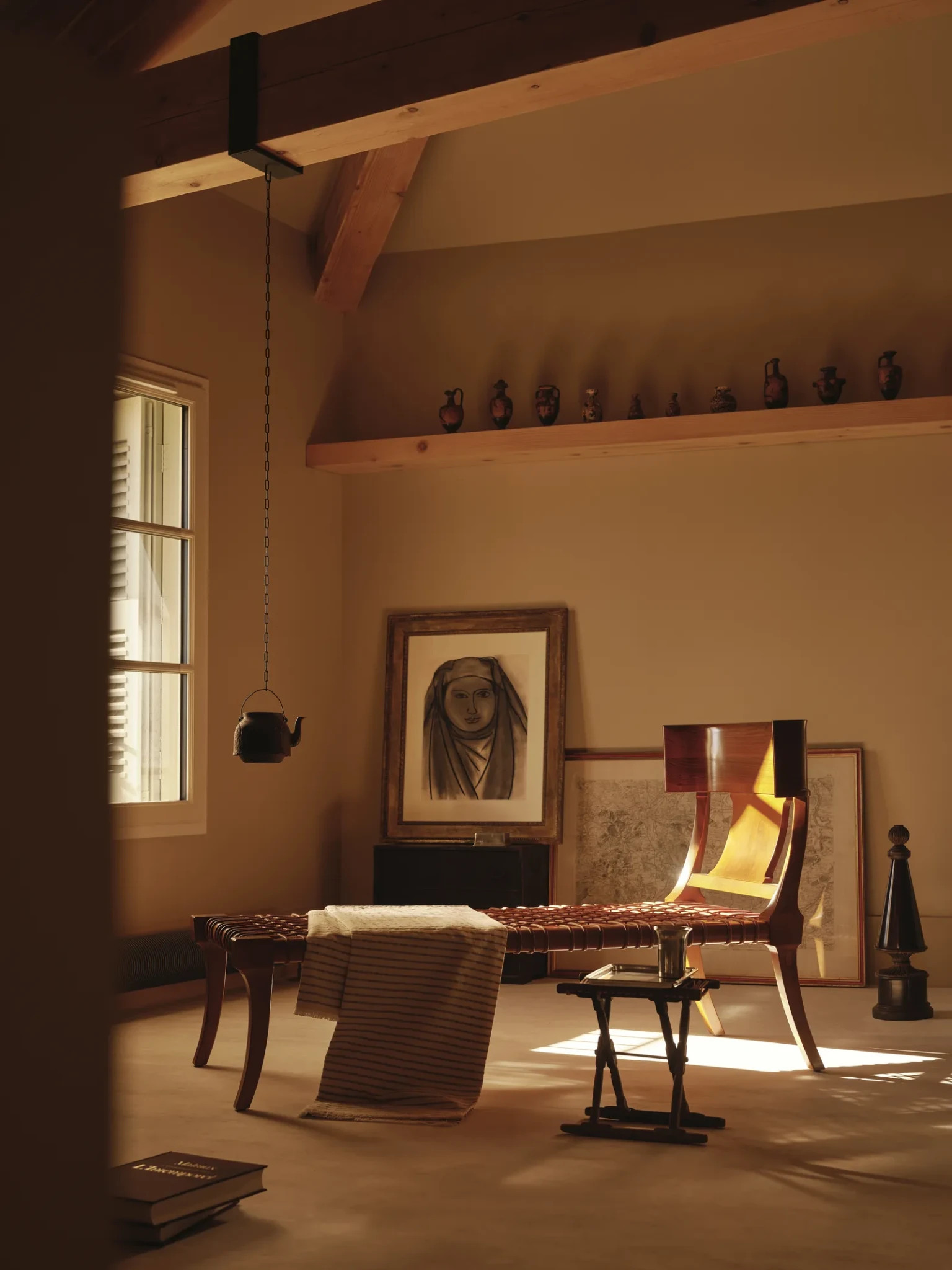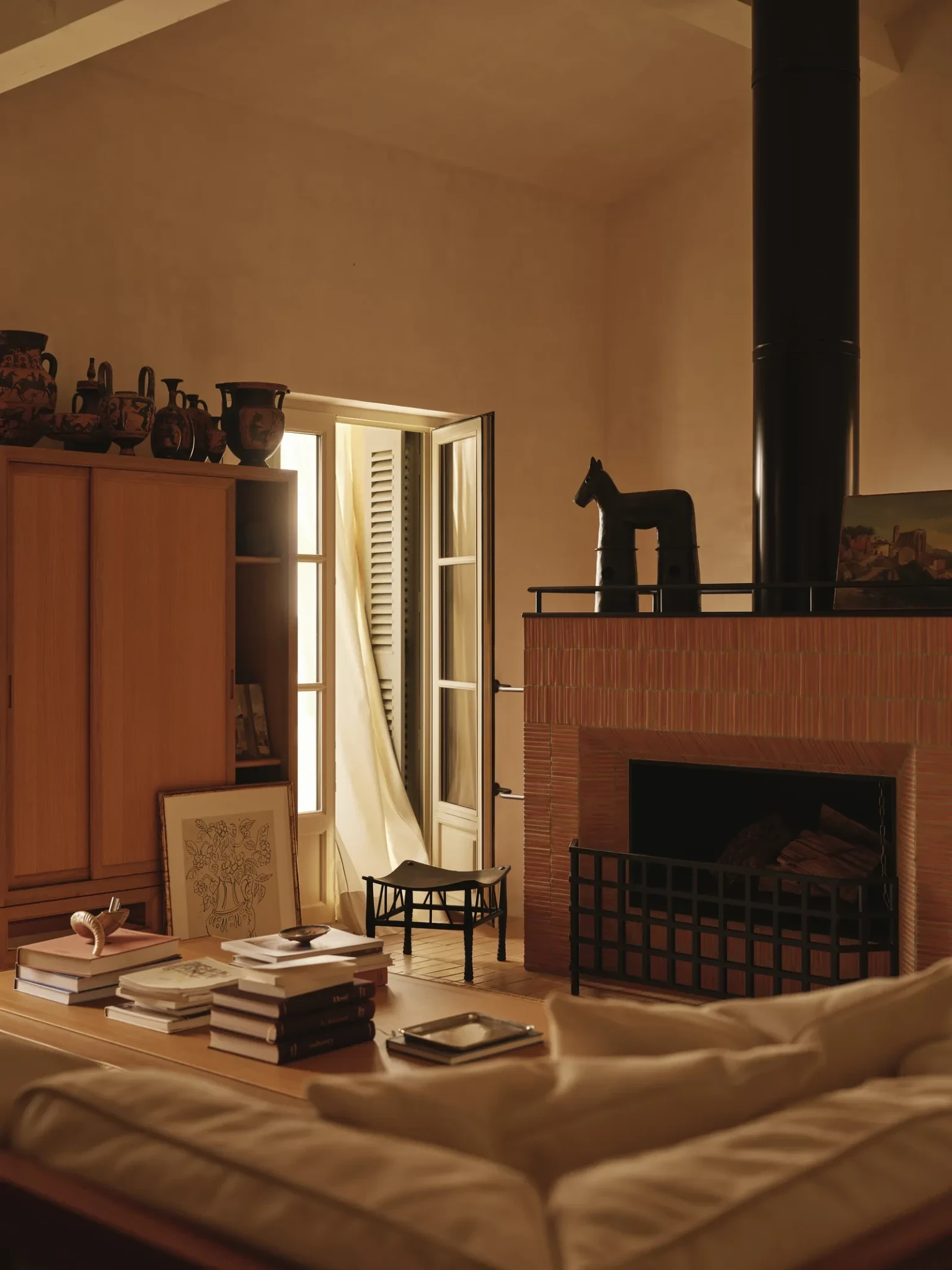 Στο επίκεντρο της κατοικίας βρίσκεται το καθιστικό, το οποίο χαρακτηρίζει μεγάλο μέρος του επάνω ορόφου. Εκεί, ένας bespoke γωνιακός καναπές από μαόνι συνδυάζεται με χειροποίητα έπιπλα και συλλεκτικά αντικείμενα, ενώ το δρύινο τραπέζι και το χαμηλό ντουλάπι που είναι κατασκευασμένο σε ιαπωνικό εργαστήριο, προσθέτουν μια ισορροπία ανάμεσα στην ευρωπαϊκή και την ασιατική αισθητική. Δίπλα τους, το σκαμπό του 19ου αιώνα και τα έργα τέχνης δημιουργούν ένα περιβάλλον που θυμίζει περισσότερο ιδιωτική γκαλερί παρά ένα τυπικό καθιστικό. Το τζάκι φτιαγμένο από τερακότα λειτουργεί ως κεντρικό σημείο αναφοράς, ενισχύοντας την αίσθηση θαλπωρής.