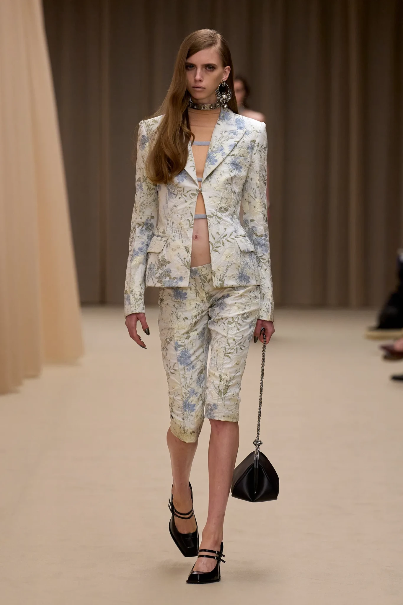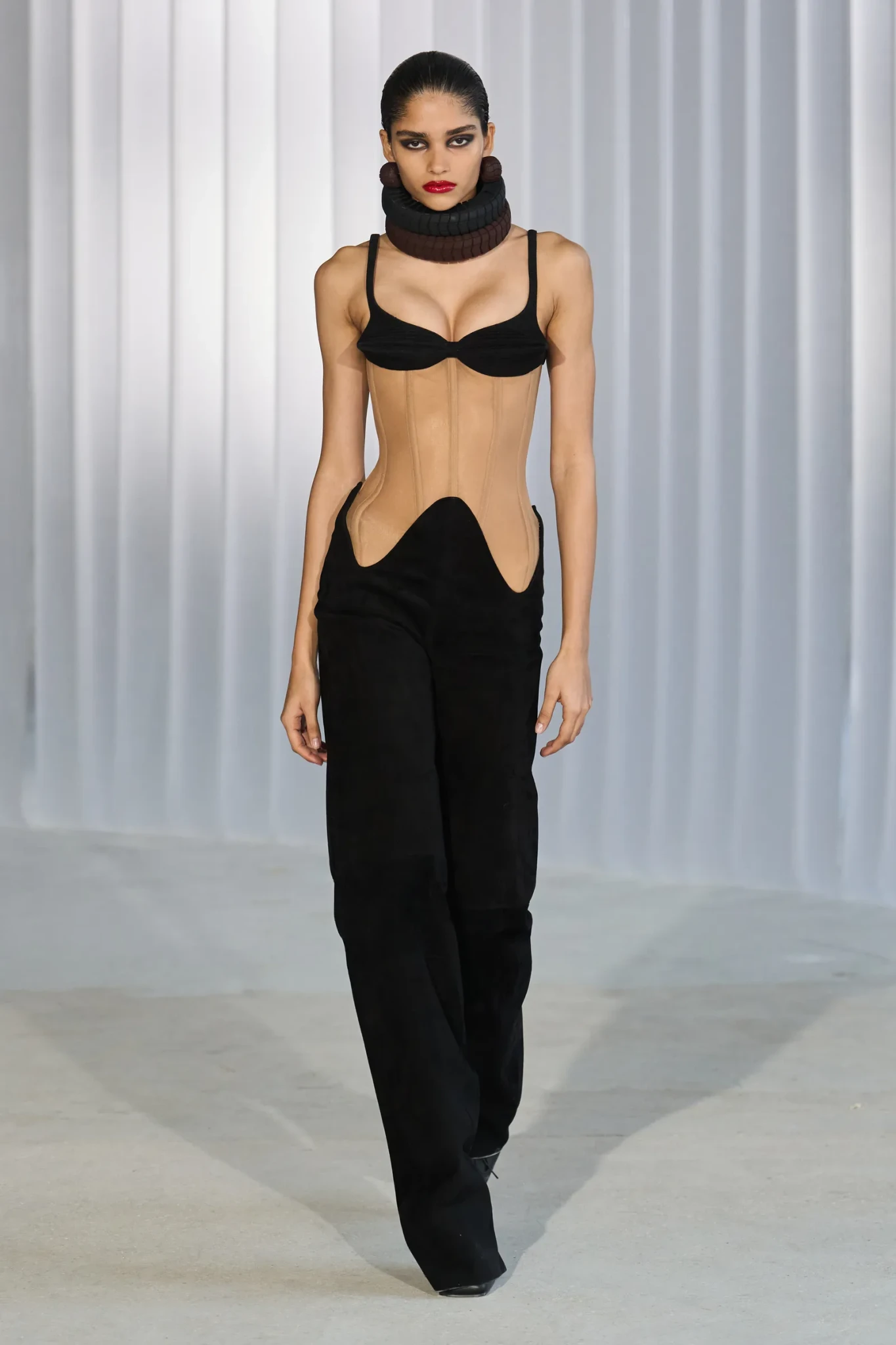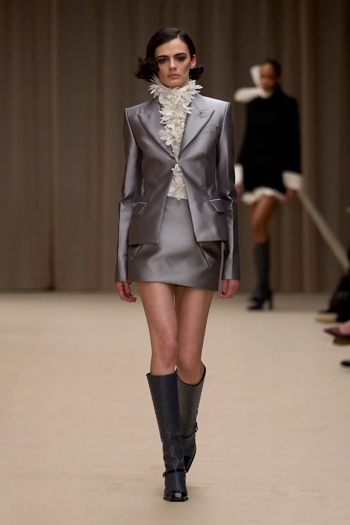 Το tailoring παραμένει εντυπωσιακό με σακάκια που κλείνουν με ένα μόνο hook κάτω από το στήθος, παραπέμποντας στη συλλογή La Poupée του 1997. Παράλληλα, εμφανίζονται στοιχεία από το ιστορικό Dante show του 1996, όπως το χαρακτηριστικό skeleton μοτίβο. Ξεχωρίζει ακόμη ένα χειροποίητο crocheted top με μεταλλικούς κρίκους και lurex νήμα – μια σύγχρονη εκδοχή chainmail που αποτυπώνει το δημιουργικό πνεύμα της ομάδας του οίκου.