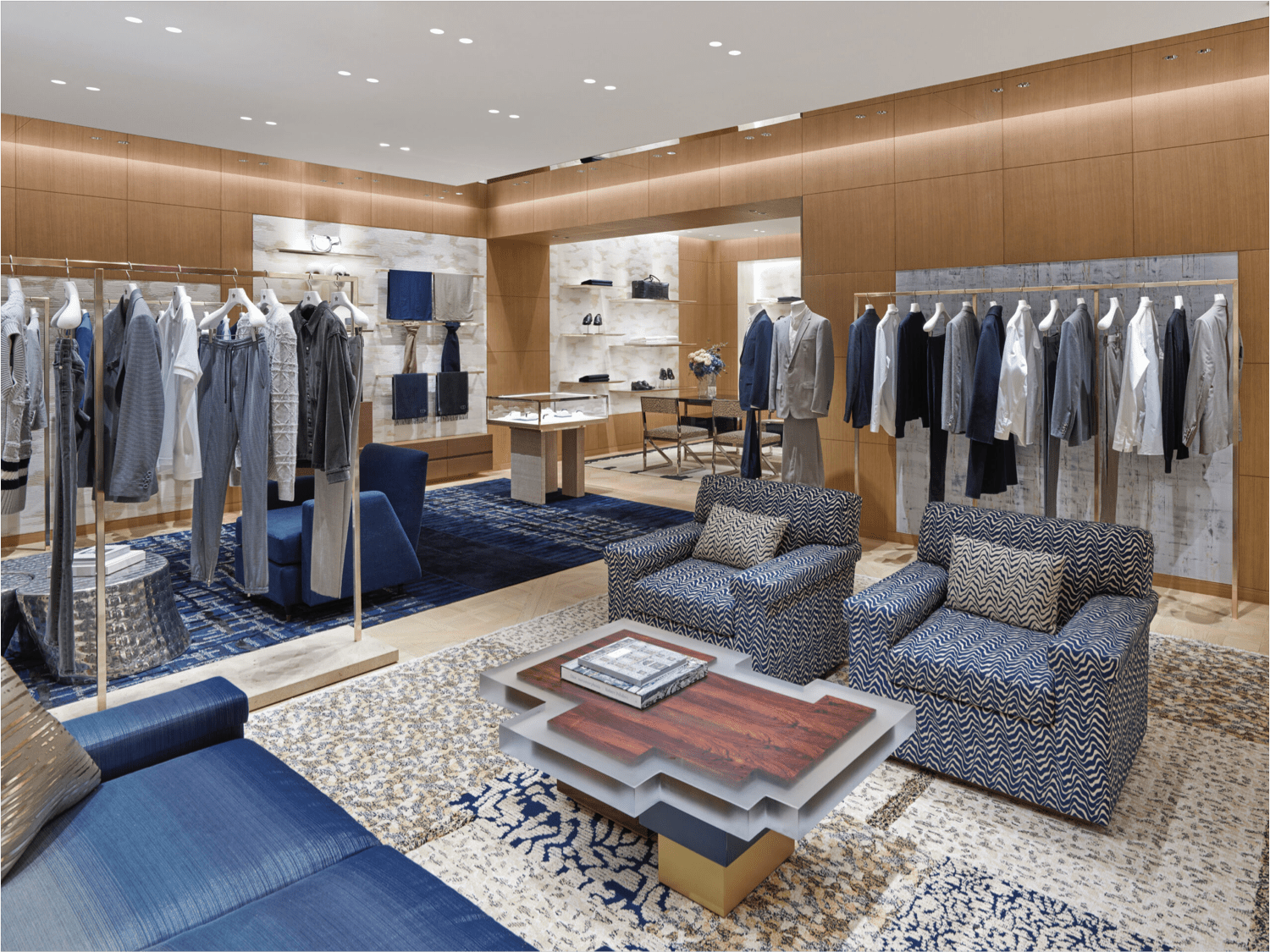 Η βασική πρόκληση για τον Marino ήταν να διατηρήσει τον χαρακτήρα «boutique feel» σε ένα κατάστημα τέτοιας κλίμακας. Το κτίριο, αποτέλεσμα ενοποίησης δύο ιστορικών οικοδομών του 1895, σχεδιάστηκε ώστε να θυμίζει δύο ξεχωριστά town houses –ένα για τις ανδρικές συλλογές και ένα για τις γυναικείες– με διαφορετικές εισόδους αλλά ενιαία εσωτερική ροή. Στους χώρους συναντάμε ιδιωτικά σαλόνια πώλησης που ανταγωνίζονται την πολυτέλεια κατοικιών υψηλής αισθητικής, έπιπλα ειδικής παραγγελίας και μεγάλες χειροποίητες μοκέτες που δημιουργούν ατμόσφαιρα οικειότητας και πολυτέλειας.