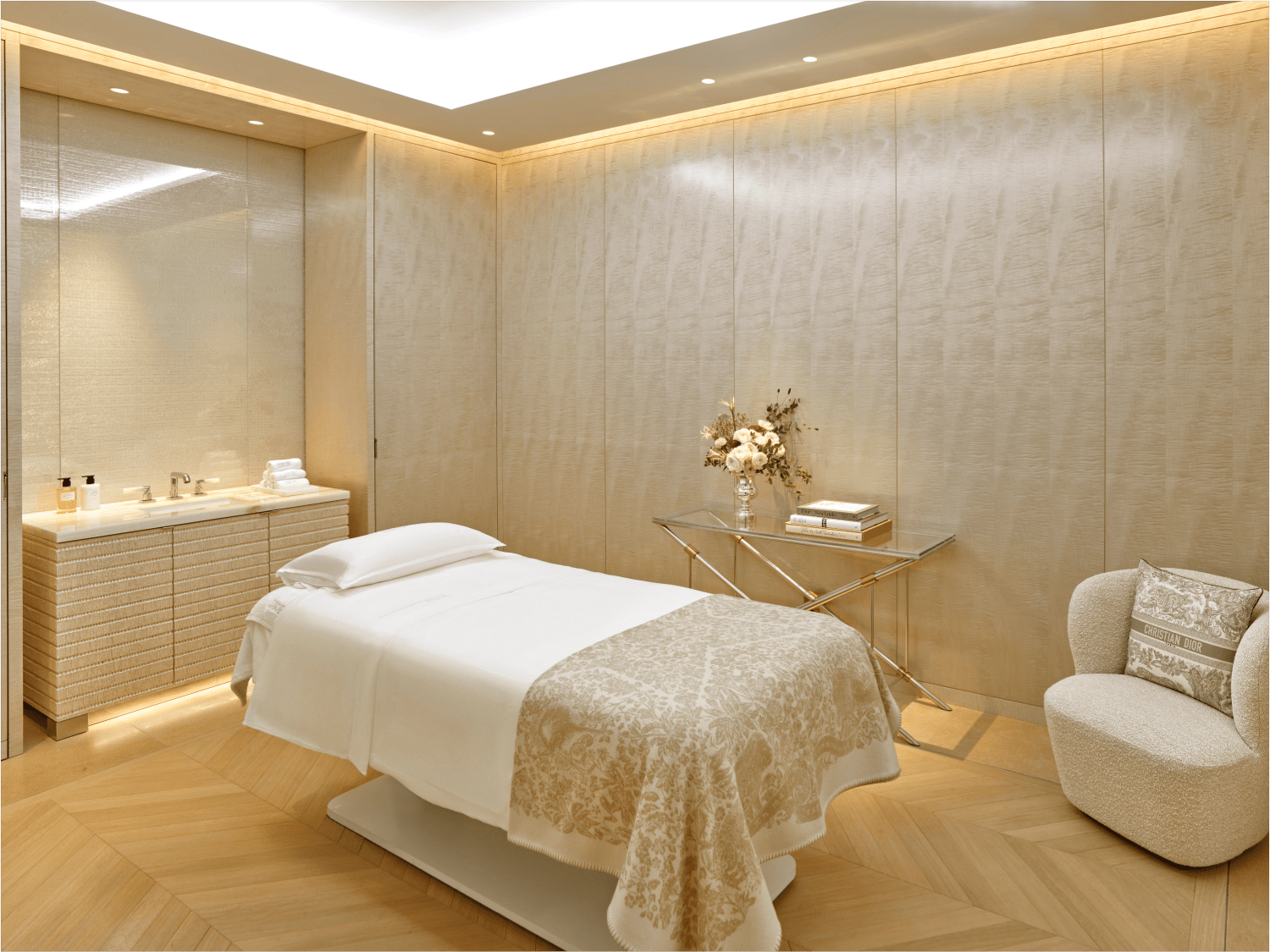 Η πολυτέλεια εκφράζεται μέσα από τις λεπτομέρειες. Χειροποίητα κεντημένες κουρτίνες, δερμάτινες επενδύσεις στις κουπαστές των σκαλών, υφάσματα αναπαραγμένα από το αρχείο του Dior, καθώς και τοιχοποιία με περίτεχνα κεντήματα στο spa. Για τον Marino, ακόμη και η αίσθηση που προσφέρει το πάχος ενός χαλιού μπορεί να διαφοροποιήσει την εμπειρία της πολυτέλειας από μια πιο κοινή ατμόσφαιρα.