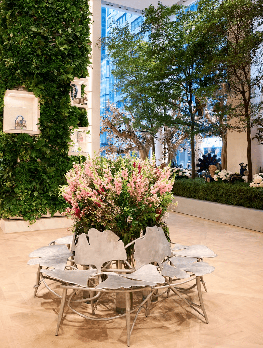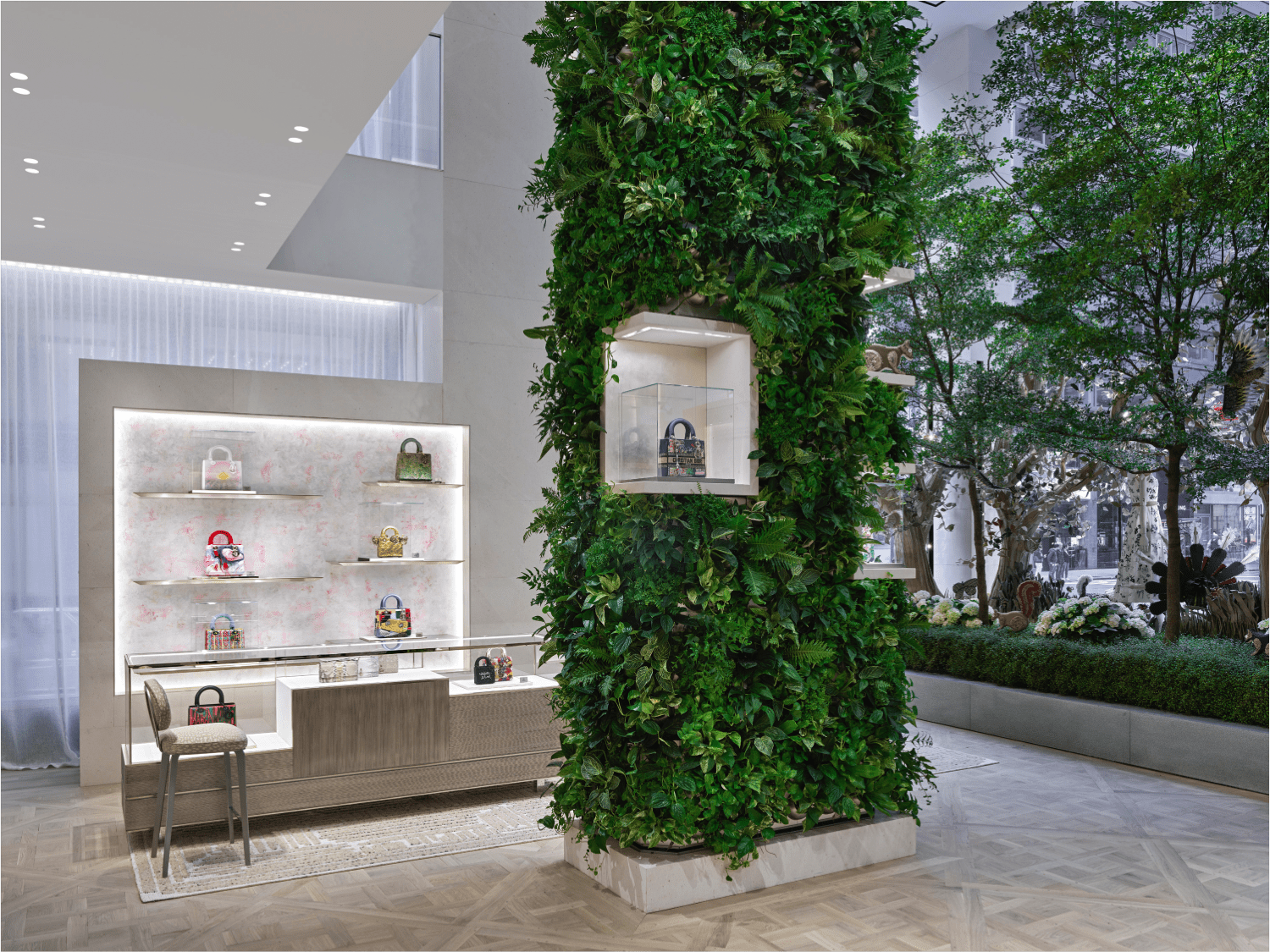Εμπνευσμένος από το πάθος του Christian Dior για την κηποτεχνία, ο Marino έφερε τη φύση στο επίκεντρο του καταστήματος. Η πρόσοψη ξεχωρίζει χάρη σε έναν πρωτοποριακό «κήπο βιτρίνας», που διαμορφώθηκε από ανακυκλωμένα υλικά, ενώ στο εσωτερικό δεσπόζει ένας εντυπωσιακός κατακόρυφος κήπος με 12 διαφορετικά είδη φυτών, σε συνεργασία με τον Βέλγο τοπιοτέχνη Peter Wirtz.