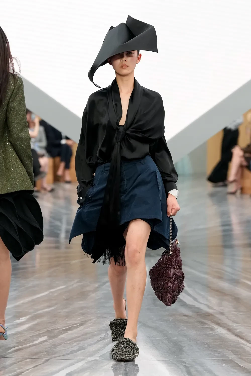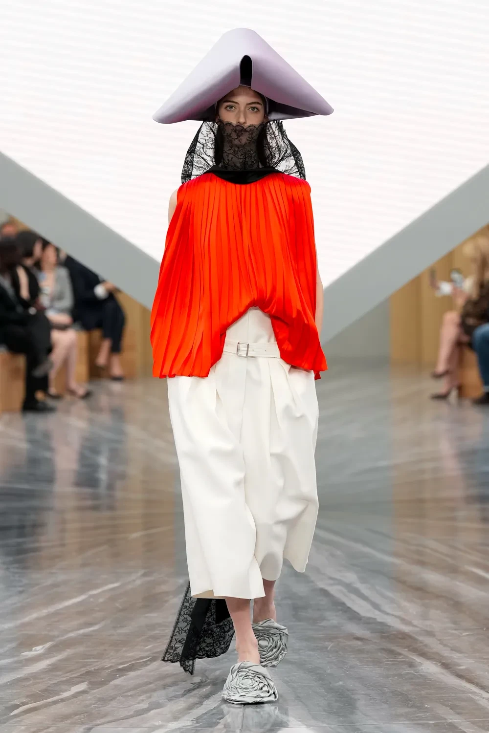 Η συλλογή του ήταν μια μελέτη αντιθέσεων: ρευστές μουσελίνες και αιθέρια βολάν συναντούσαν αυστηρά κοστούμια με αρχιτεκτονική δομή, ενώ οι παστέλ αποχρώσεις και τα λουλουδάτα μοτίβα έσπασαν τη μονοχρωμία του γκρι, του μαύρου και του λευκού. Υπερμεγέθη καπέλα σαν origami, πανωφόρια που θύμιζαν κουκούλια, παγιέτες που έλαμπαν στη σκηνή και λεπτομέρειες bib ολοκλήρωναν μια εικόνα γεμάτη δυναμισμό, θηλυκότητα και χιούμορ.