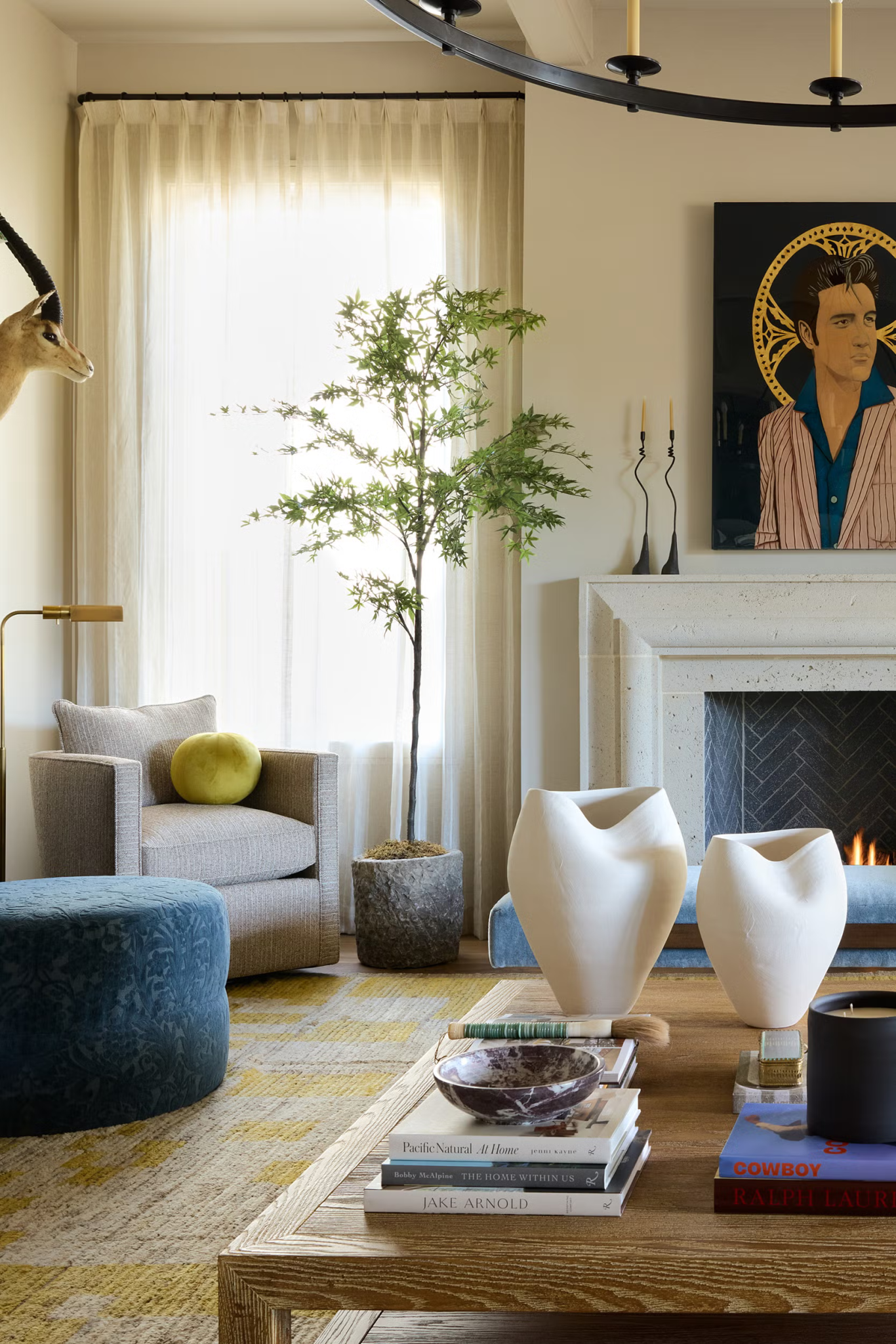 Ο βασικός χώρος του καθιστικού δημιουργήθηκε γύρω από την έννοια της άνεσης. Μεγάλοι καναπέδες σε ουδέτερες αποχρώσεις δημιουργούν μια χαλαρή βάση, ενώ διακοσμητικά μαξιλάρια και ριχτάρια σε πιο έντονους τόνους πρόσθεσαν βάθος και χαρακτήρα. Ένα ξύλινο coffee table με φυσική υφή λειτουργεί ως κεντρικό στοιχείο στον χώρο, ενώ γύρω του τοποθετούνται πολυθρόνες με καμπύλες γραμμές που ενισχύουν τη φιλόξενη ατμόσφαιρα. Στους τοίχους, τα έργα τέχνης και οι φωτογραφίες προσδίδουν προσωπικότητα, μετατρέποντας το καθιστικό σε ένα δωμάτιο που αντικατοπτρίζει τη ζωή της οικογένειας. Η διάταξη του χώρου παραμένει ανοιχτή, επιτρέποντας την οπτική σύνδεση με την κουζίνα και την τραπεζαρία, στοιχείο που ενισχύει την αίσθηση της συνοχής στο σπίτι.