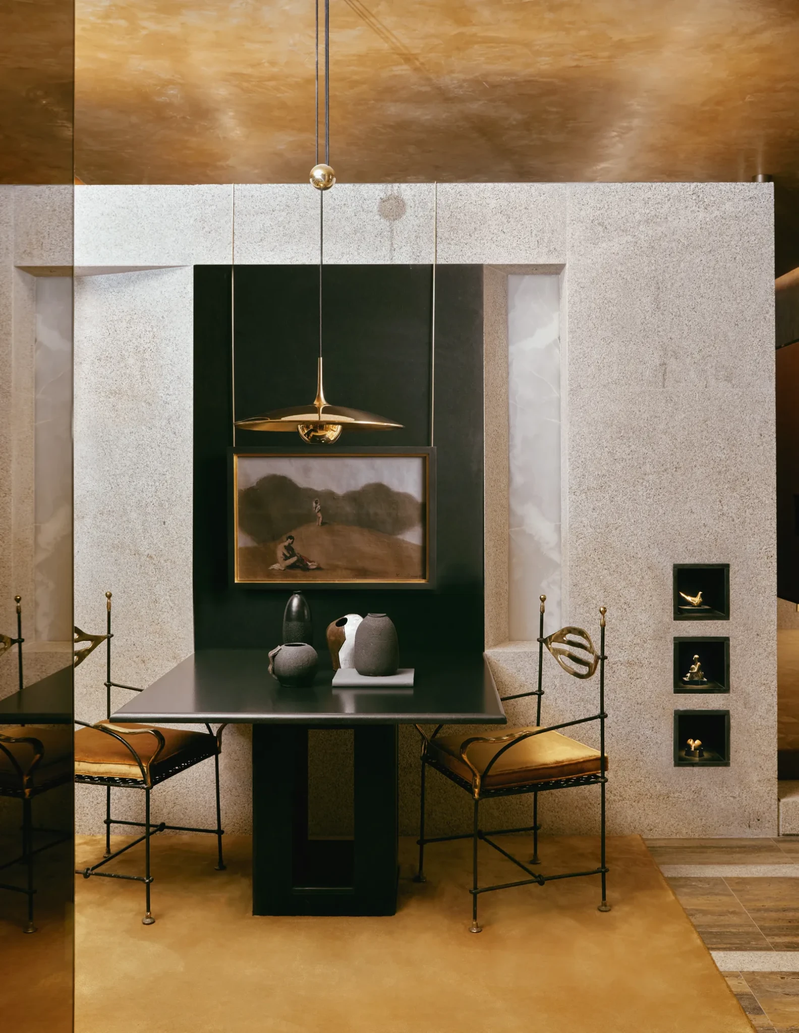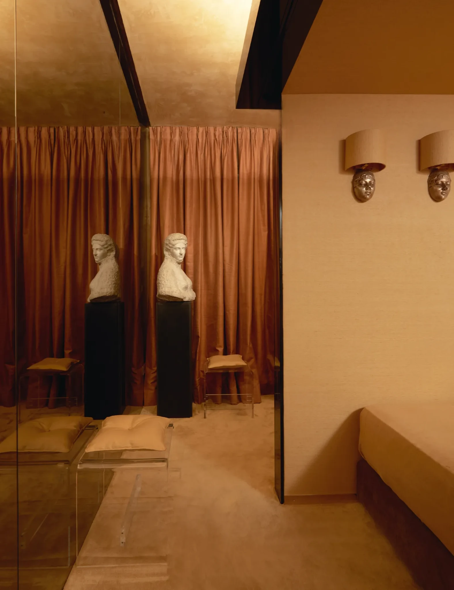 Μικρές οπτικές ψευδαισθήσεις πολλαπλασιάζουν τις προοπτικές και προσθέτουν δραματικότητα. Οι οροφές φαίνονται υψηλότερες, οι καθρέφτες δημιουργούν ψευδαίσθηση βάθους, ενώ το κεντρικό θερμοκήπιο λειτουργεί σαν θεατρική παύση στον χώρο. Κάθε λεπτομέρεια, από ένα χρυσό διακοσμητικό στοιχείο μέχρι έναν καθρέφτη, κρύβει μια αίσθηση θησαυρού, όπως ένα κομψό κοσμηματοθήκη που αποκαλύπτεται σιγά σιγά.