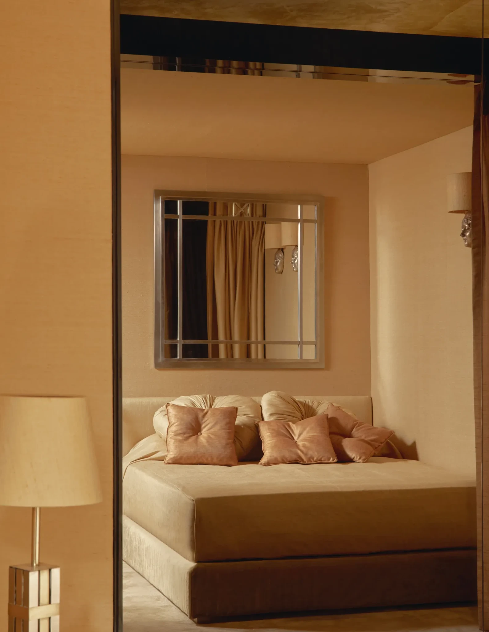 Η πολυτέλεια εκφράζεται μέσα από μια εκλεπτυσμένη παλέτα υλικών: τραβερτίνη από καρυδιά, γκρι και μαύρο γρανίτη, όνυχα, μετάξι, βερνικωμένο ξύλο, χειροποίητο ρωμαϊκό μωσαϊκό, βελούδο mioré, καθρέφτες με πατίνα και μέταλλα όπως ορείχαλκος, χρώμιο, μπρούντζος και ατσάλι. Οι τοίχοι και οι οροφές από σοβά συνομιλούν με τα υφάσματα που αλλάζουν χρώμα ανάλογα με τη γωνία του φωτός, δημιουργώντας την αίσθηση ότι ο χώρος ακτινοβολεί από μέσα προς τα έξω.