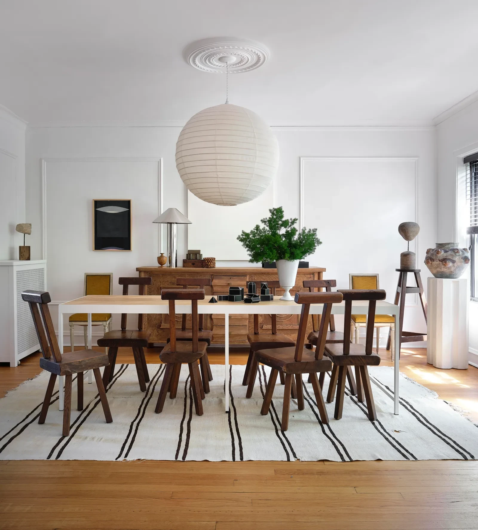 Η τραπεζαρία κυριαρχείται από ένα μακρύ, κομψό τραπέζι, κομμάτι της Jayson Home που δεν χώραγε στο προηγούμενο σπίτι του, πλαισιωμένο από βελγικές ξύλινες καρέκλες. Το δωμάτιο φιλοξενεί άνετα δείπνα ή απογευματινά ποτά, με την αίσθηση μιας ιδιωτικής λέσχης. Ο ξενώνας λειτουργεί ταυτόχρονα ως καθιστικό, με έναν μεγάλο sectional καναπέ που μπορεί να μετακινηθεί για να υποδεχθεί επισκέπτες.
