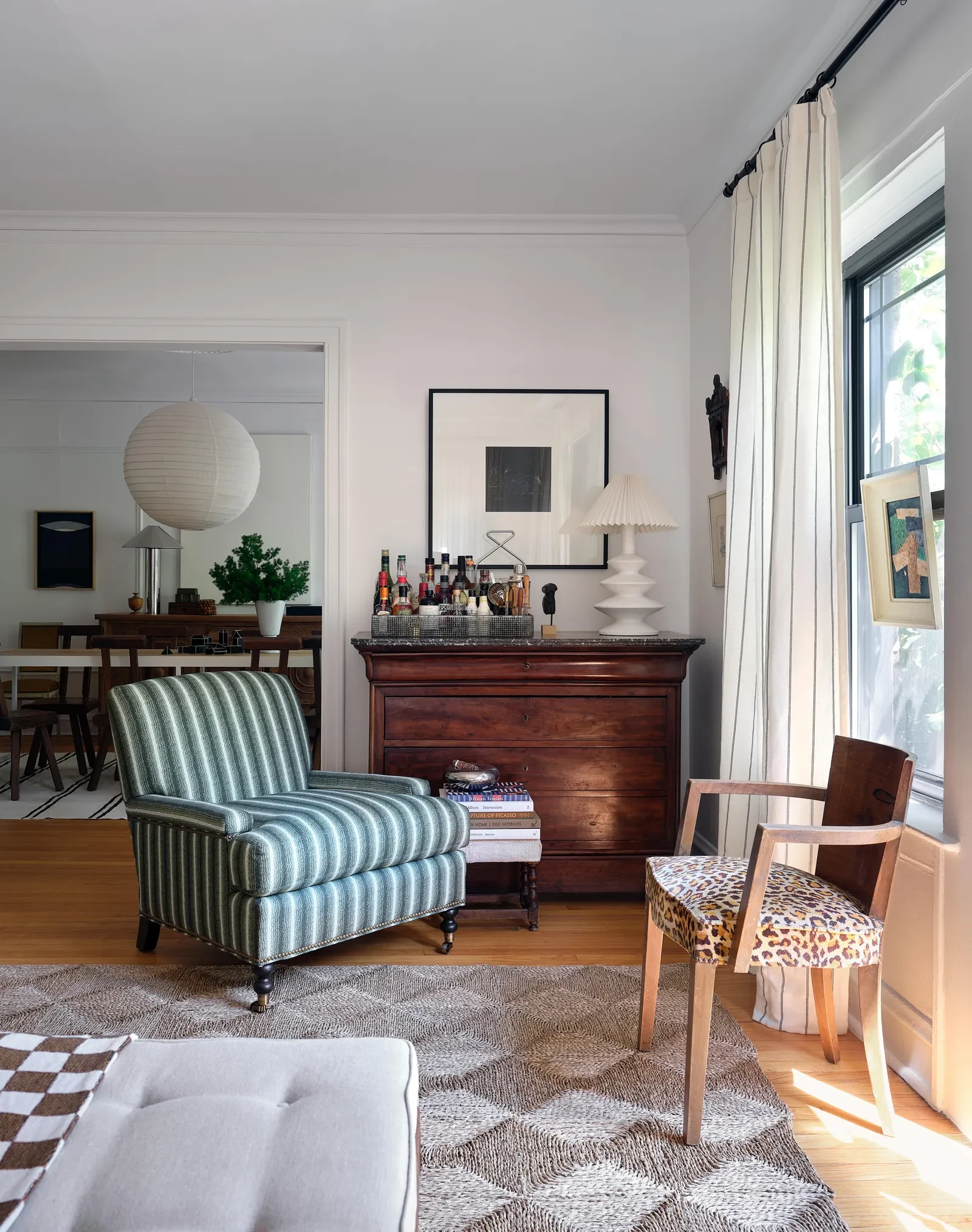 Μια από τις πιο χαρακτηριστικές στιγμές του νέου του σπιτιού αφορά το μαρμάρινο μαντεμένιο περίβλημα του τζακιού, ένα εύρημα του Facebook Marketplace που εξελίχθηκε σε περιπέτεια. Το απέκτησε μέσα στη νύχτα, οδηγώντας μόνος του ένα φορτηγό στα προάστια του Σικάγο, κουβαλώντας το κομμάτι στις σκάλες, κυριολεκτικά με κόπο και μώλωπες. Το αποτέλεσμα όμως άξιζε κάθε προσπάθεια. Το τζάκι δεσπόζει σήμερα στο καθιστικό, πλαισιωμένο από δύο art deco πολυθρόνες με leopard μοτίβο, δημιουργώντας ένα σημείο συνάντησης για φίλους, κοκτέιλ και ατελείωτες συζητήσεις.