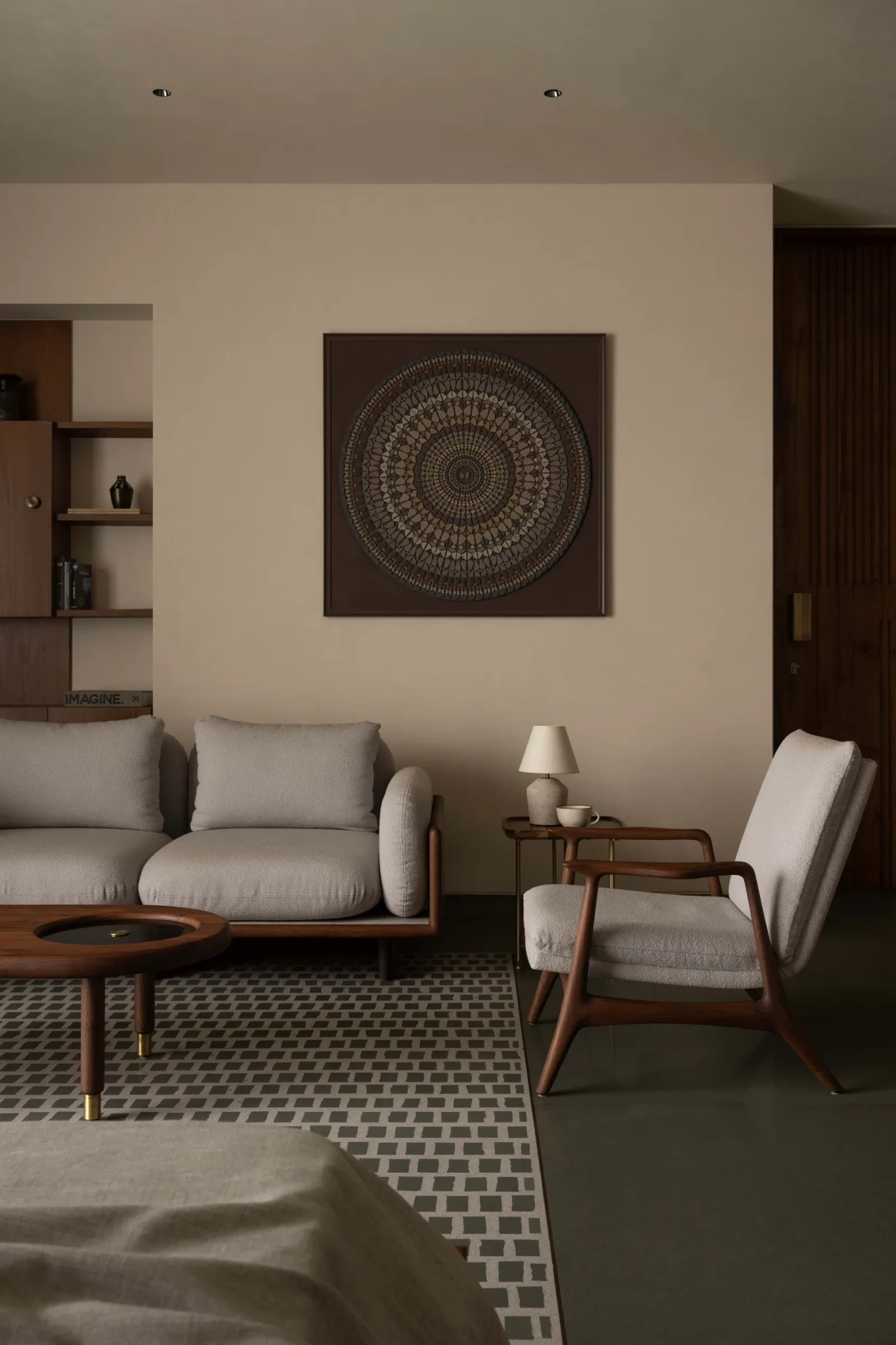 Οι χώροι καθιστικού διαχωρίζονται διακριτικά σε πιο επίσημους και μη, ανταποκρινόμενοι στις διαφορετικές ανάγκες της καθημερινότητας. Η διάκριση αυτή επιτρέπει τόσο τη φιλοξενία όσο και την ιδιωτικότητα. Ένα από τα πιο χαρακτηριστικά στοιχεία είναι οι παραδοσιακές κούνιες (hichkos), που είναι τοποθετημένες στο μπαλκόνι και κοντά στην τραπεζαρία. Αυτές λειτουργούν ως σημεία χαλάρωσης και κοινωνικής αλληλεπίδρασης, μεταφέροντας την εμπειρία της αυλής στο αστικό περιβάλλον. Τα έπιπλα είναι λιτά, με έμφαση στην άνεση και τη λειτουργικότητα, ενώ οι υφές παραμένουν φυσικές και ανεπιτήδευτες.