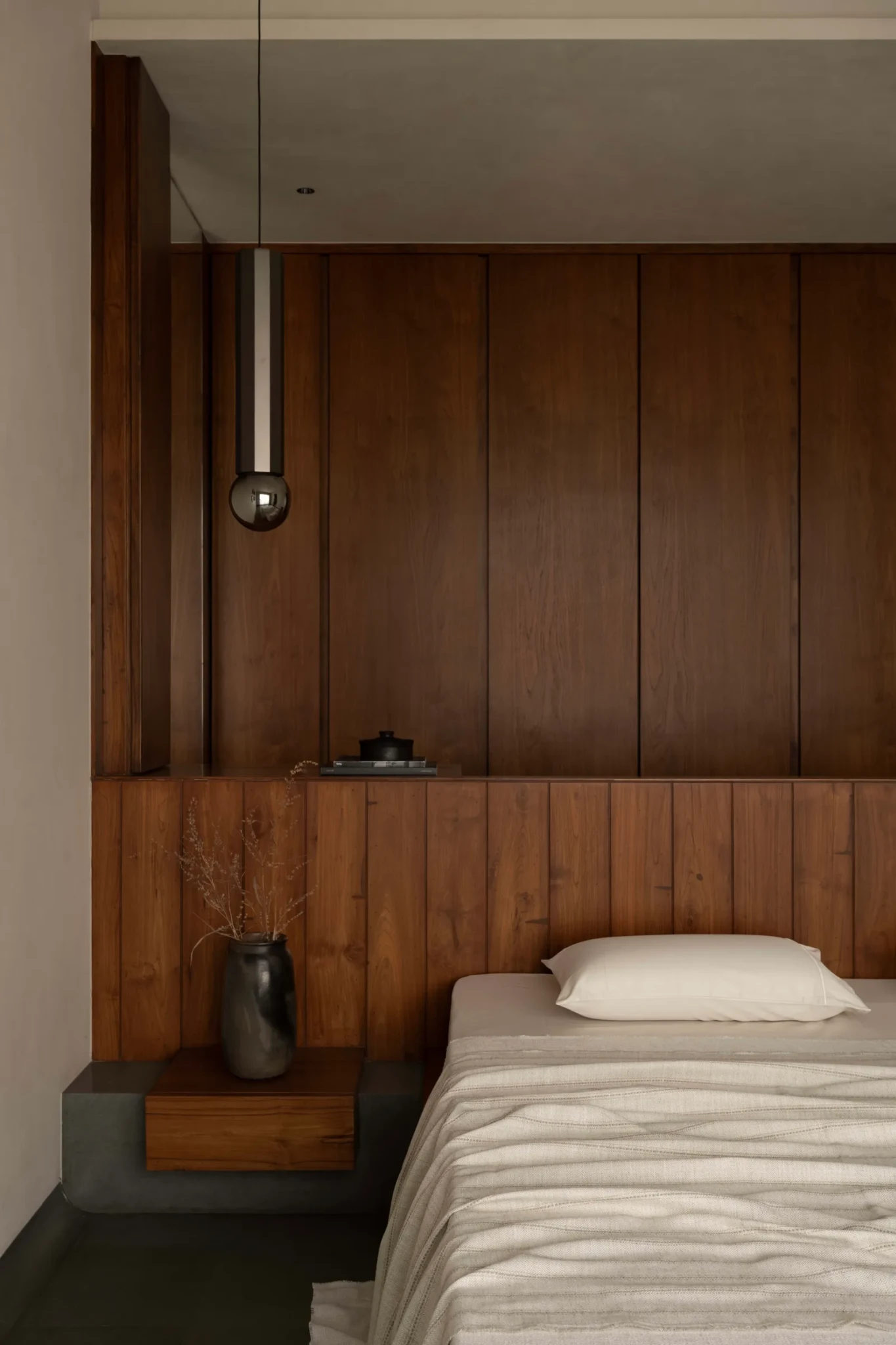 Η φιλοσοφία του «material honesty» αποτελεί βασικό στοιχείο του design. Αντί για πολυτελή, γυαλιστερά φινιρίσματα, επιλέχθηκαν υλικά που ανταποκρίνονται στο κλίμα και στον τρόπο ζωής των κατοίκων. Οι τοίχοι καλύπτονται με lime plaster, που συμβάλλει στη ρύθμιση της θερμοκρασίας, ενώ τα δάπεδα διατηρούνται δροσερά ακόμα και στις υψηλές θερμοκρασίες της περιοχής. Η πέτρα κυριαρχεί σε όλο το σπίτι, με επιφάνειες όπως οι τοίχοι και τα δάπεδα να αποκτούν μια φυσική, ήρεμη υφή. Παράλληλα, το ξύλο και οι διακριτικές μπρούτζινες λεπτομέρειες προσθέτουν ζεστασιά και ισορροπία. Ιδιαίτερο ενδιαφέρον παρουσιάζουν τα δάπεδα με τα ένθετα μοτίβα πέτρας, που θυμίζουν σύγχρονα terrazzo «χαλιά», προσφέροντας ρυθμό και οπτική συνέχεια στον χώρο.