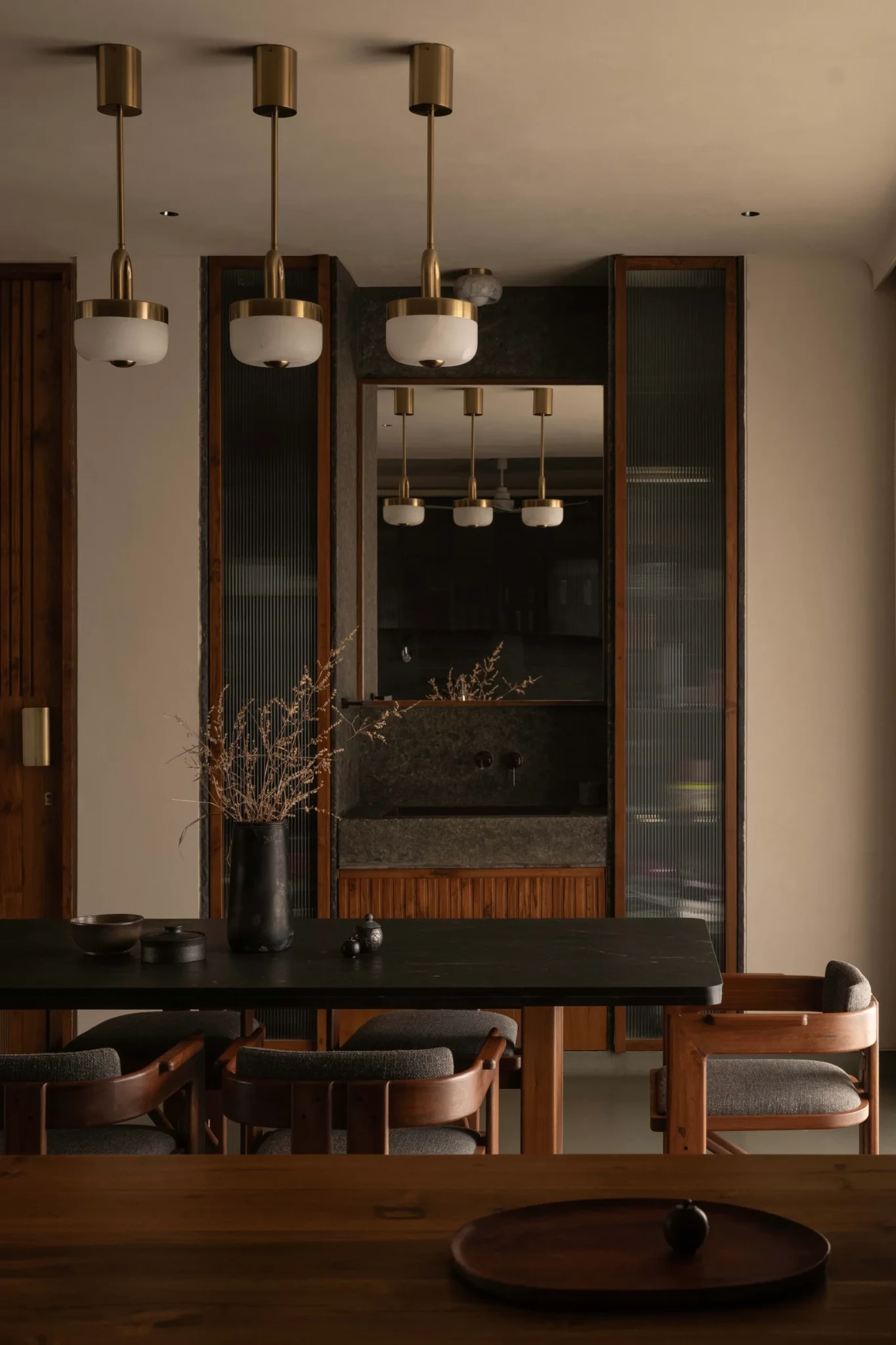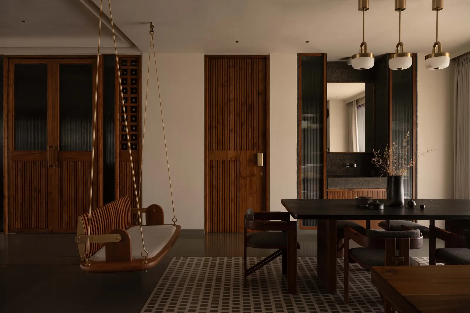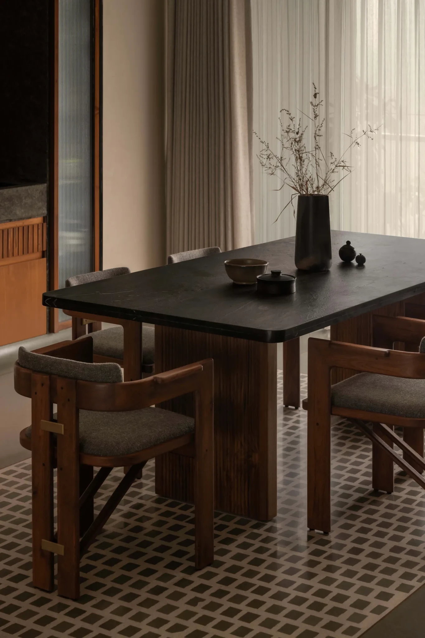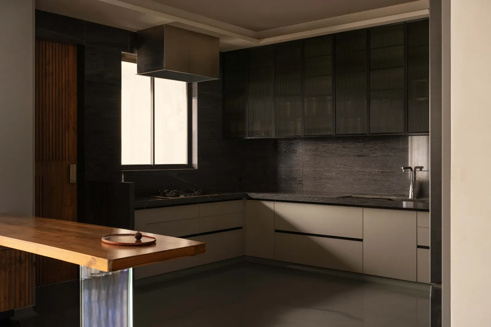 Στον πυρήνα του σπιτιού βρίσκεται ο χώρος της κουζίνας και της τραπεζαρίας, που λειτουργεί ως σημείο συγκέντρωσης. Στην Gujarati κουλτούρα, το φαγητό αποτελεί βασικό στοιχείο φιλοξενίας, και αυτό αποτυπώνεται ξεκάθαρα στον σχεδιασμό. Η κουζίνα είναι ανοιχτή και συνδέεται άμεσα με την τραπεζαρία, επιτρέποντας την αδιάκοπη επικοινωνία μεταξύ των μελών της οικογένειας και των επισκεπτών. Η διάταξη αυτή διευκολύνει τη ροή και ενισχύει την αίσθηση της κοινότητας μέσα στο σπίτι. Τα έπιπλα παραμένουν λειτουργικά και διακριτικά, με ξύλινες επιφάνειες και καθαρές γραμμές που εξυπηρετούν την καθημερινότητα χωρίς περιττές διακοσμήσεις.