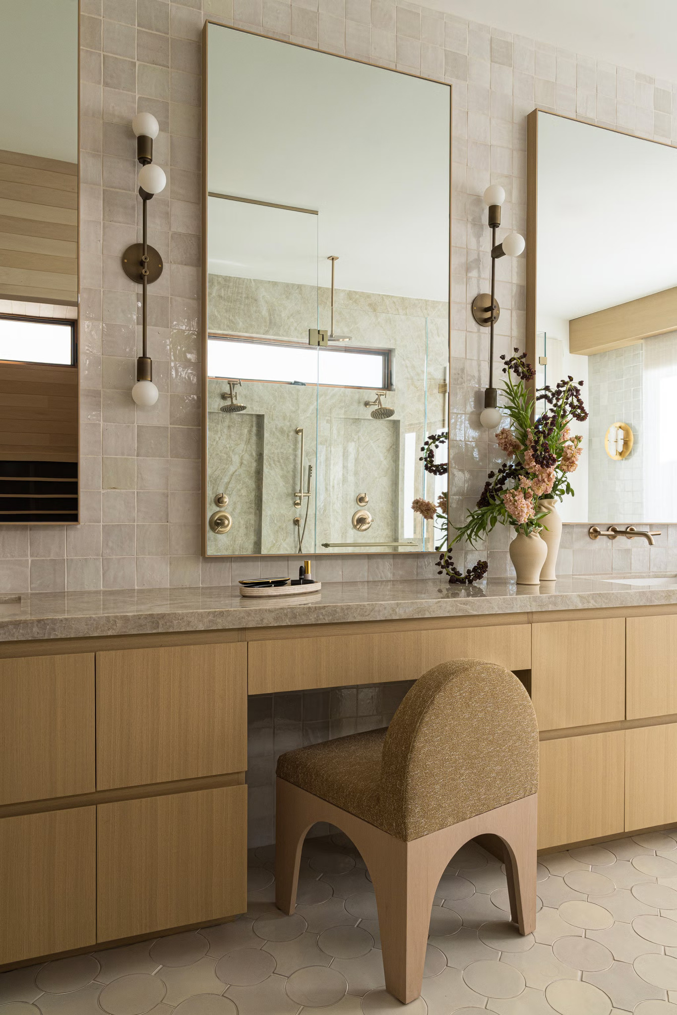 Ο ξενώνας ξεχωρίζει για τα κάθετα πάνελ στους τοίχους, που προσθέτουν ύψος και αρχιτεκτονικό ενδιαφέρον. Η χρωματική παλέτα παραμένει ουδέτερη, δίνοντας έμφαση στην υφή και στην άνεση. Αντίστοιχα, το μπάνιο της κόρης της οικογένειας διακρίνεται για τη φωτεινότητα και την καθαρότητά του, με μαρμάρινες λεπτομέρειες και διαχρονικά υλικά που εξασφαλίζουν κομψότητα χωρίς υπερβολές.