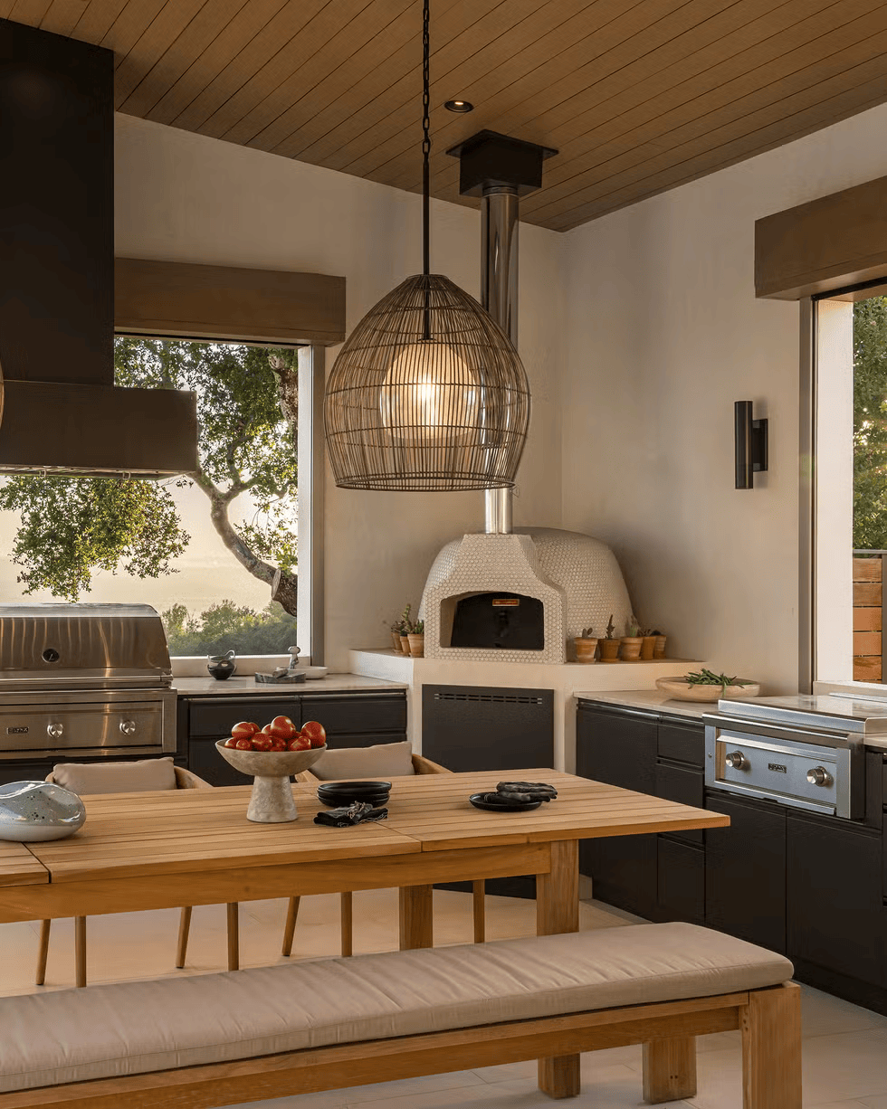 Η εμπειρία ολοκληρώνεται στον εξωτερικό χώρο, όπου η πισίνα, η υπαίθρια κουζίνα και οι ζώνες καθιστικού συνθέτουν ένα σκηνικό φιλοξενίας και χαλάρωσης. Τα φυσικά υλικά συνεχίζουν και εδώ, δημιουργώντας μια οπτική συνοχή.