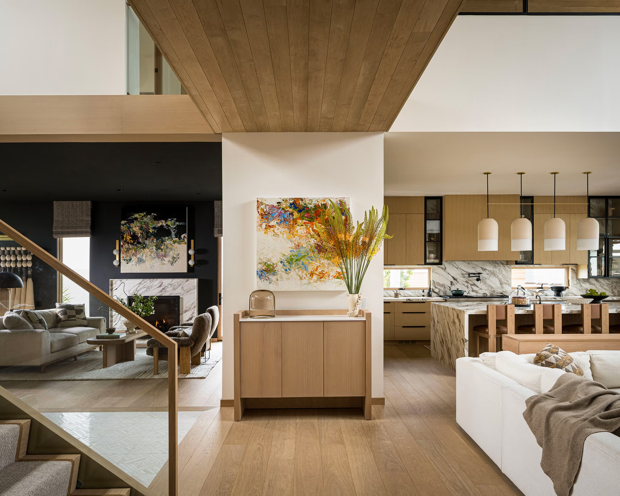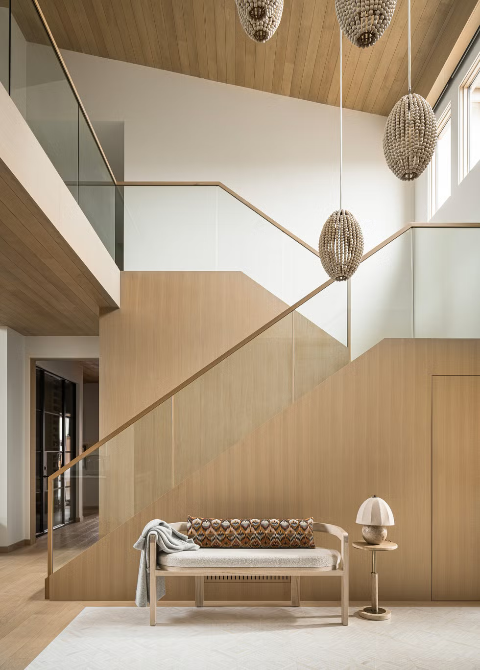 Η είσοδος σε αυτό το σπίτι θέτει αμέσως το πλαίσιο της εμπειρίας που ακολουθεί. Το φως κινείται ανάμεσα σε δρύινα πλαίσια, δημιουργώντας μια απαλή υφή και αισθητική συνέχεια. Η ενότητα των υλικών συνεχίζεται στον ευρύχωρο διάδρομο και στη δραματική σκάλα που οδηγεί προς τους χώρους του σπιτιού, αναδεικνύοντας την αρχιτεκτονική καθαρότητα και την προσοχή στη λεπτομέρεια. Ο συνδυασμός μαρμάρου και ζεστών φυσικών υλικών δημιουργεί μια ιδανική ισορροπία ανάμεσα στα υλικά.