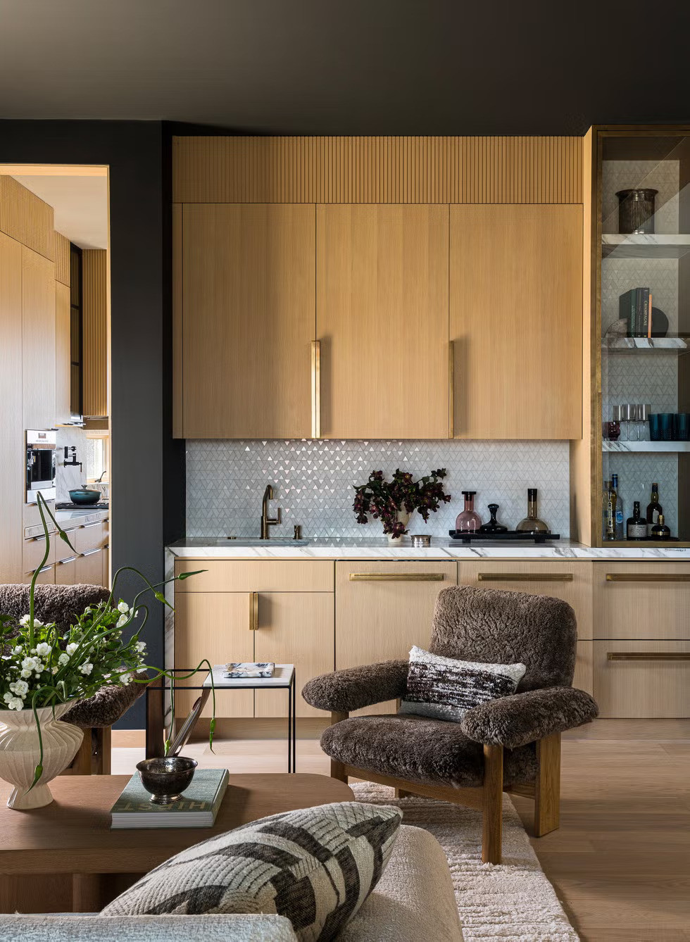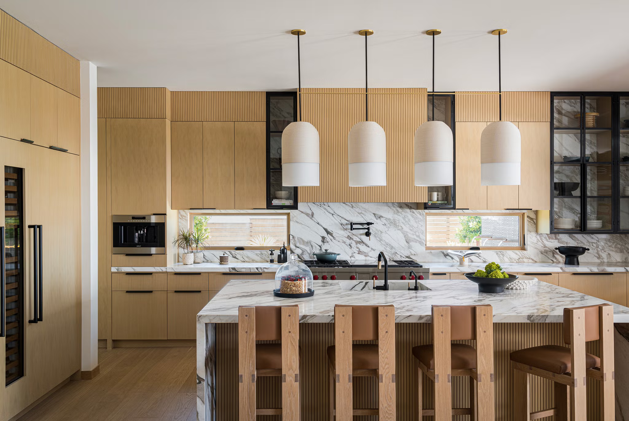Η κουζίνα αποτελεί κεντρικό πυρήνα του σπιτιού. Οι επιφάνειες από Calacatta Vagli μάρμαρο αναδεικνύουν τη φυσική ομορφιά του υλικού, ενώ τα ντουλάπια με λεπτομέρειες tambour προσθέτουν υφή. Η κεντρική νησίδα, σχεδιασμένη ως ενιαίο γλυπτικό στοιχείο, προσφέρει έναν γενναιόδωρο χώρο προετοιμασίας του φαγητού αλλά παράλληλα αποτελεί και σημείο συγκέντρωσης της οικογένειας. Οι μεταλλικές λεπτομέρειες και οι εντοιχισμένες συσκευές διατηρούν την καθαρότητα των γραμμών, ενισχύοντας την αίσθηση της αρμονίας.