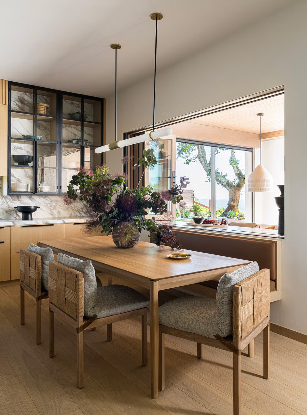 Σε άμεση σύνδεση με την κουζίνα, η τραπεζαρία χαρακτηρίζεται άπλετο φυσικό φως. Η ενσωματωμένη καθιστική γωνία κάτω από το παράθυρο δημιουργεί μια χαλαρή ατμόσφαιρα, ενώ το μεγάλο τραπέζι από φυσικό ξύλο λειτουργεί και πάλι ως σημείο συνάντησης. Η μετάβαση προς τον εξωτερικό χώρο είναι ομαλή, επιτρέποντας στο τοπίο να γίνεται αναπόσπαστο μέρος του δωματίου.