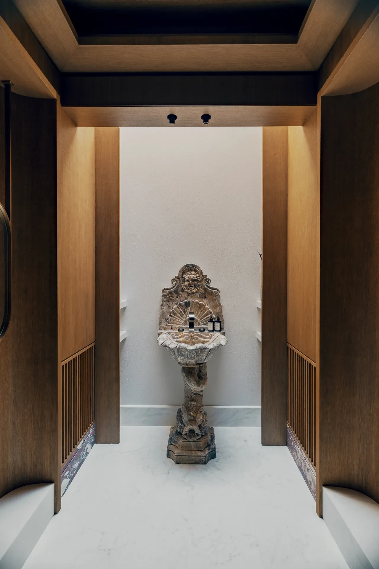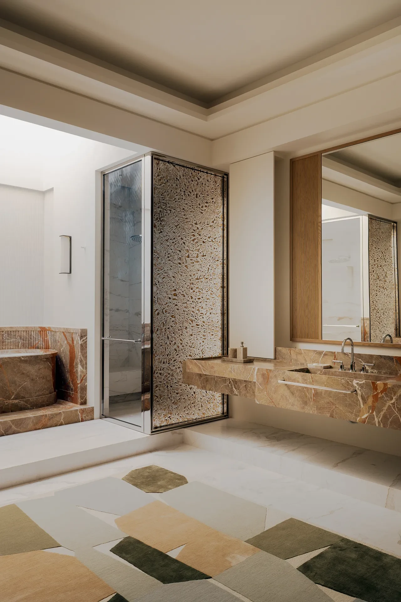 Στο κύριο μπάνιο του σπιτιού ενσωματώθηκαν παχιά γυάλινα στοιχεία και ένα ειδικά διακοσμημένο τζάμι με πινελιές χαλκού, μια λεπτομέρεια που αποπνέει τεχνική και αισθητική δεξιοτεχνία. Μέσα από αυτή τη διαδικασία, οι τοπικές παραδόσεις δεν γίνονται μόνο ένα μέσο κατασκευής, αλλά και μέρος της ίδιας της αρχιτεκτονικής φυσιογνωμίας του σπιτιού.