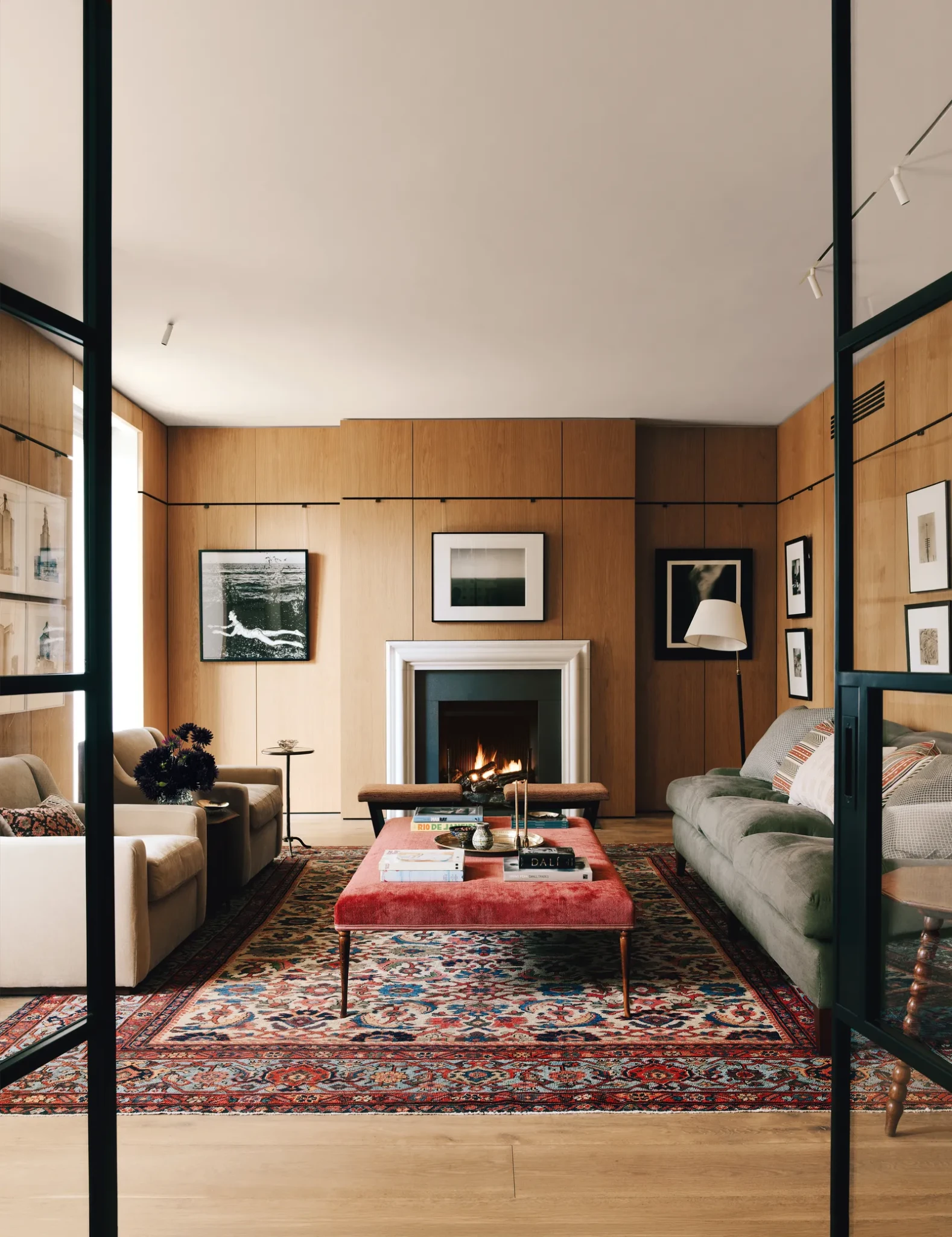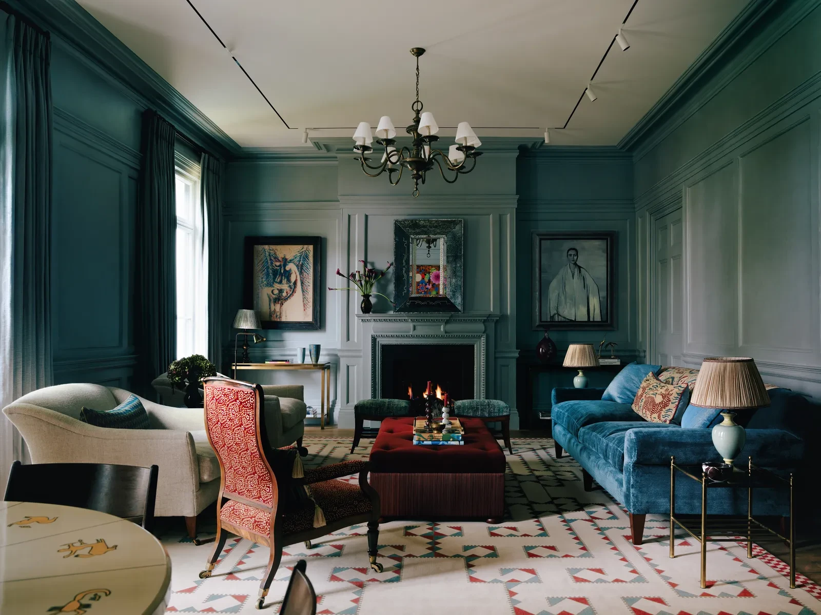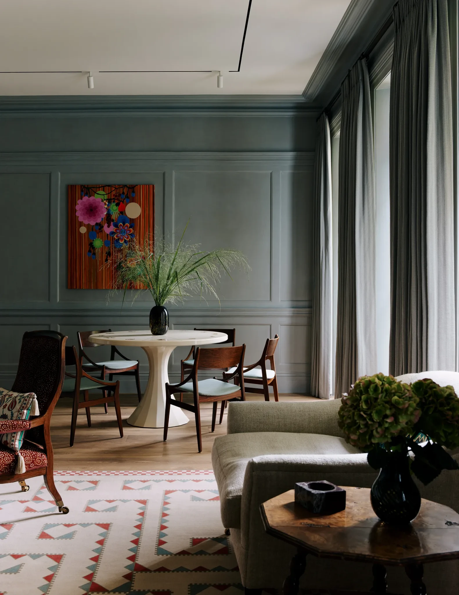 Το επίσημο καθιστικό διατηρεί έναν πιο κλασικό χαρακτήρα, με τοίχους σε βαθιές αποχρώσεις και έμφαση στη λεπτομέρεια. Η επιλογή χρωμάτων, όπως το χαρακτηριστικό γκρι-μωβ, δημιουργεί μια αίσθηση βάθους, ενώ το μαρμάρινο τζάκι λειτουργεί ως σημείο αναφοράς στον χώρο. Τα έπιπλα συνδυάζουν διαφορετικές εποχές μέσα από τις vintage πολυθρόνες, τους custom καναπέδες και τις αντίκες που έχουν επενδυθεί με σύγχρονα υφάσματα. Υφές όπως λινό, μαλλί και βαμβάκι συνυπάρχουν, δημιουργώντας ένα αποτέλεσμα που δεν μοιάζει επιτηδευμένο αλλά φυσικά εξελιγμένο. Η παρουσία των έργων τέχνης και των κεραμικών ενισχύει την προσωπικότητα του χώρου, μετατρέποντας το καθιστικό σε μια ζωντανή σύνθεση αντικειμένων και αναφορών.