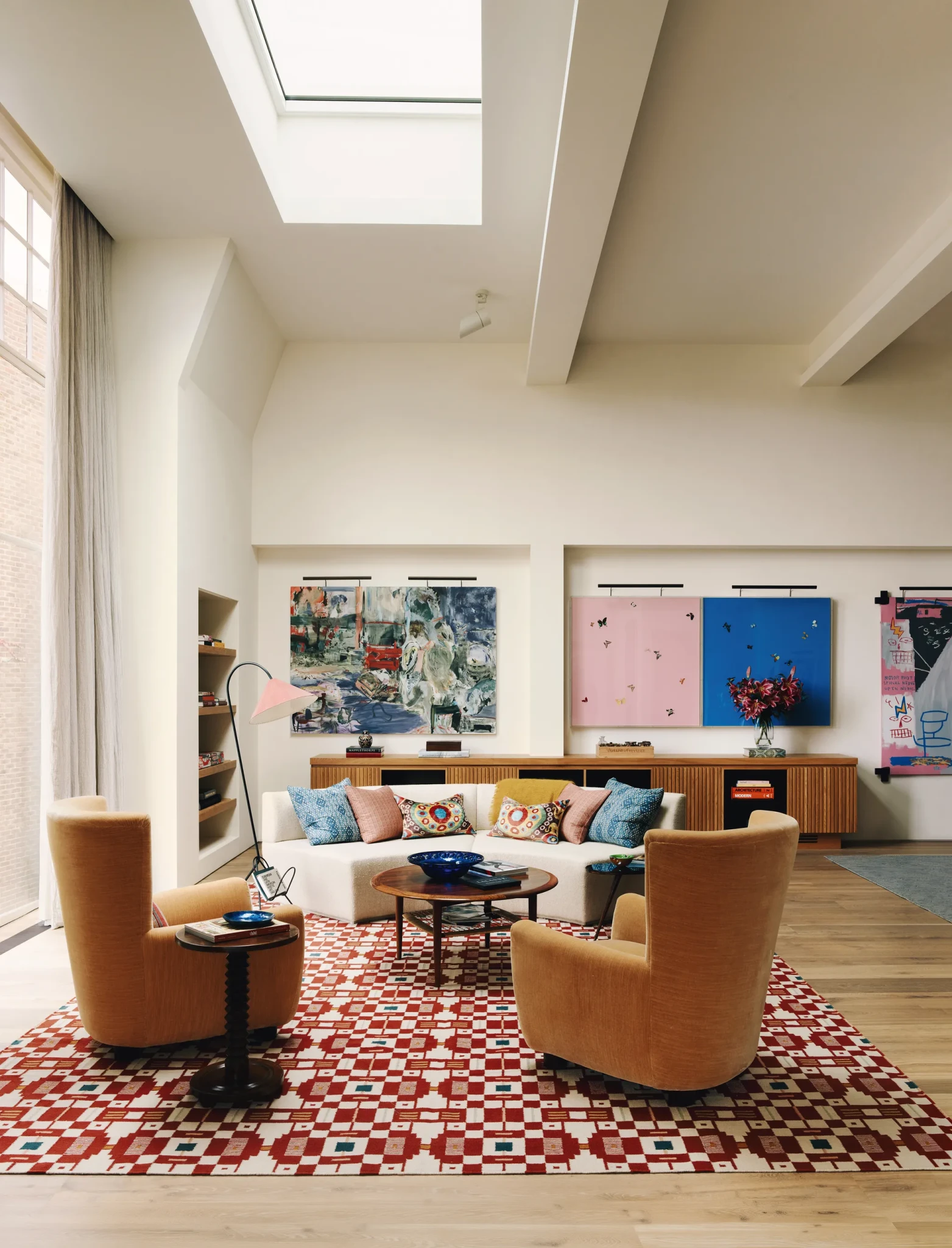 Στον χώρο του καθιστικού, οι mid-century πολυθρόνες συνδυάζονται με έναν custom καναπέ, αποδεικνύοντας τη σημασία της εξατομίκευσης για την επίτευξη της άνεσης και της αισθητικής ισορροπίας.