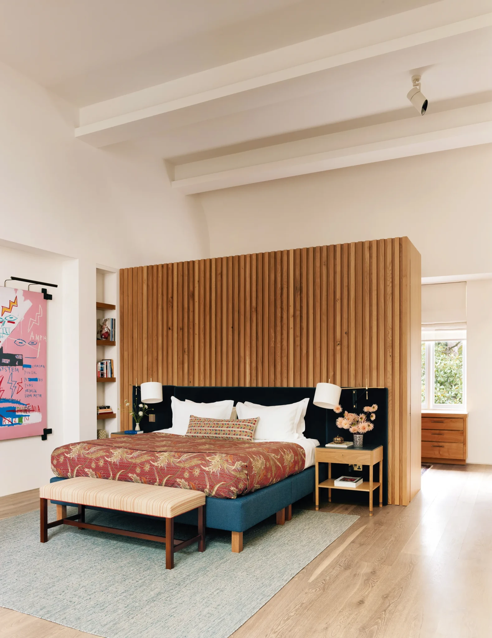 Στους επάνω ορόφους, η προσέγγιση γίνεται πιο ήρεμη αλλά εξίσου προσεγμένη. Στα υπνοδωμάτια, αντικείμενα όπως οι bobbin chairs και τα χειροποίητα μαξιλάρια δημιουργούν έναν διάλογο ανάμεσα στο παραδοσιακό και το σύγχρονο. Η αποθήκευση ενσωματώνεται διακριτικά, ενώ κάθε δωμάτιο διατηρεί τη δική του ταυτότητα μέσα από μικρές και επιλεγμένες λεπτομέρειες.