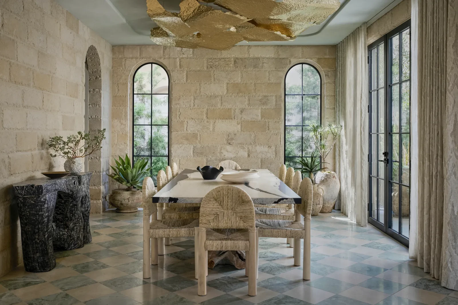 Στην καρδιά του σπιτιού βρίσκεται η τραπεζαρία, τοποθετημένη στρατηγικά ώστε να συνδέει όλα τα υπόλοιπα δωμάτια. Αντί να λειτουργεί ως ένας ξεχωριστός χώρος, μετατρέπεται σε κεντρικό σημείο κίνησης και συνάντησης, ενισχύοντας τη συνολική ροή της κατοικίας. Ο χώρος ξεχωρίζει για τις εντυπωσιακές λεπτομέρειες με τους τοίχους να είναι επενδυμένοι με πέτρα σε θερμές αποχρώσεις, το δάπεδο από μάρμαρο σε μοτίβο σκακιέρας και τα μεγάλα, καμπύλα παράθυρα που αφήνουν το φως να πλημμυρίζει το δωμάτιο. Στο κέντρο, ένα τραπέζι δώδεκα θέσεων με μεταλλική επιφάνεια αντανακλά το φως και τα φωτιστικά οροφής, δημιουργώντας μια αίσθηση κίνησης και ζωντάνιας. Τα φωτιστικά λειτουργούν σχεδόν σαν γλυπτική εγκατάσταση, προσθέτοντας θεατρικότητα χωρίς να βαραίνουν τον χώρο.