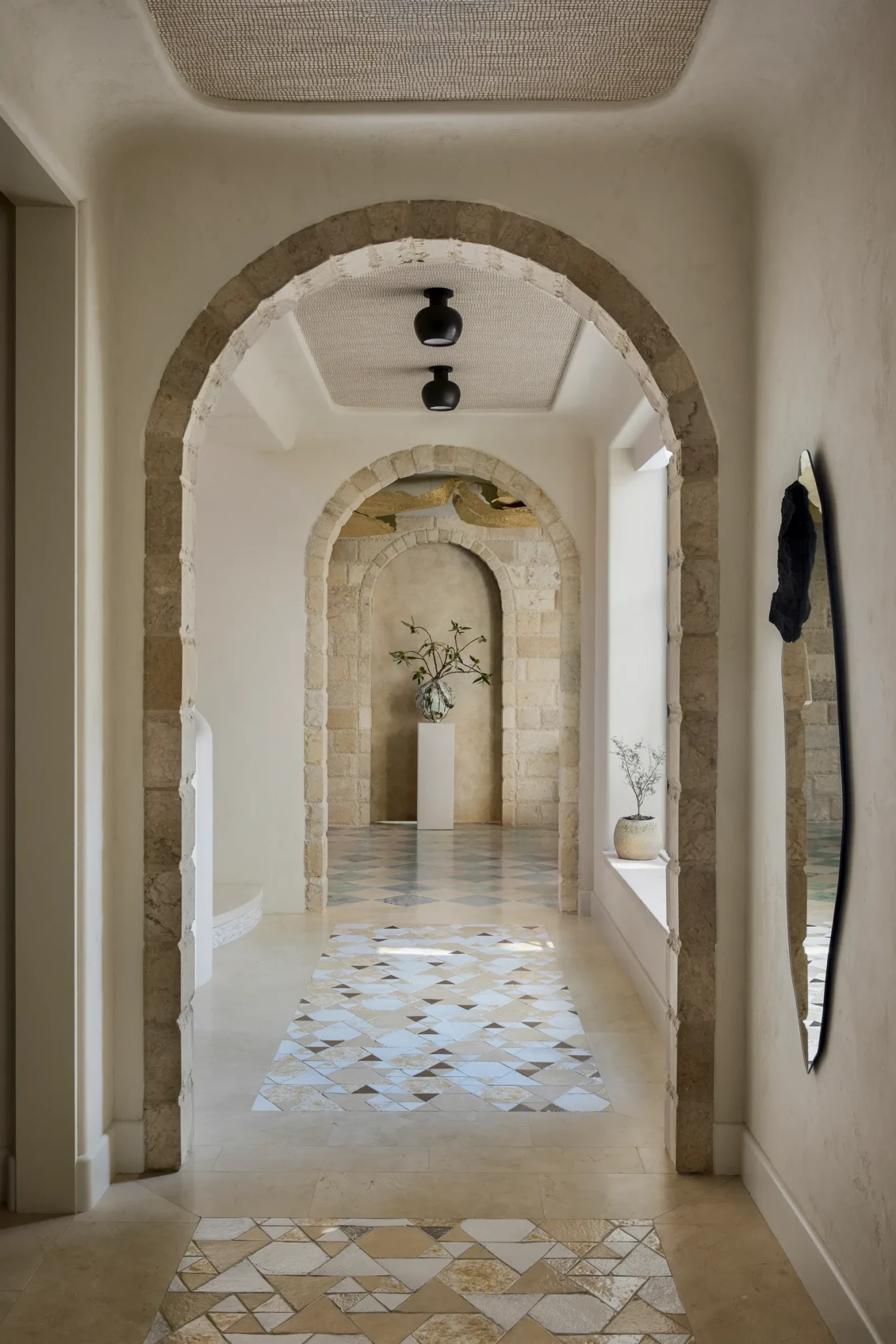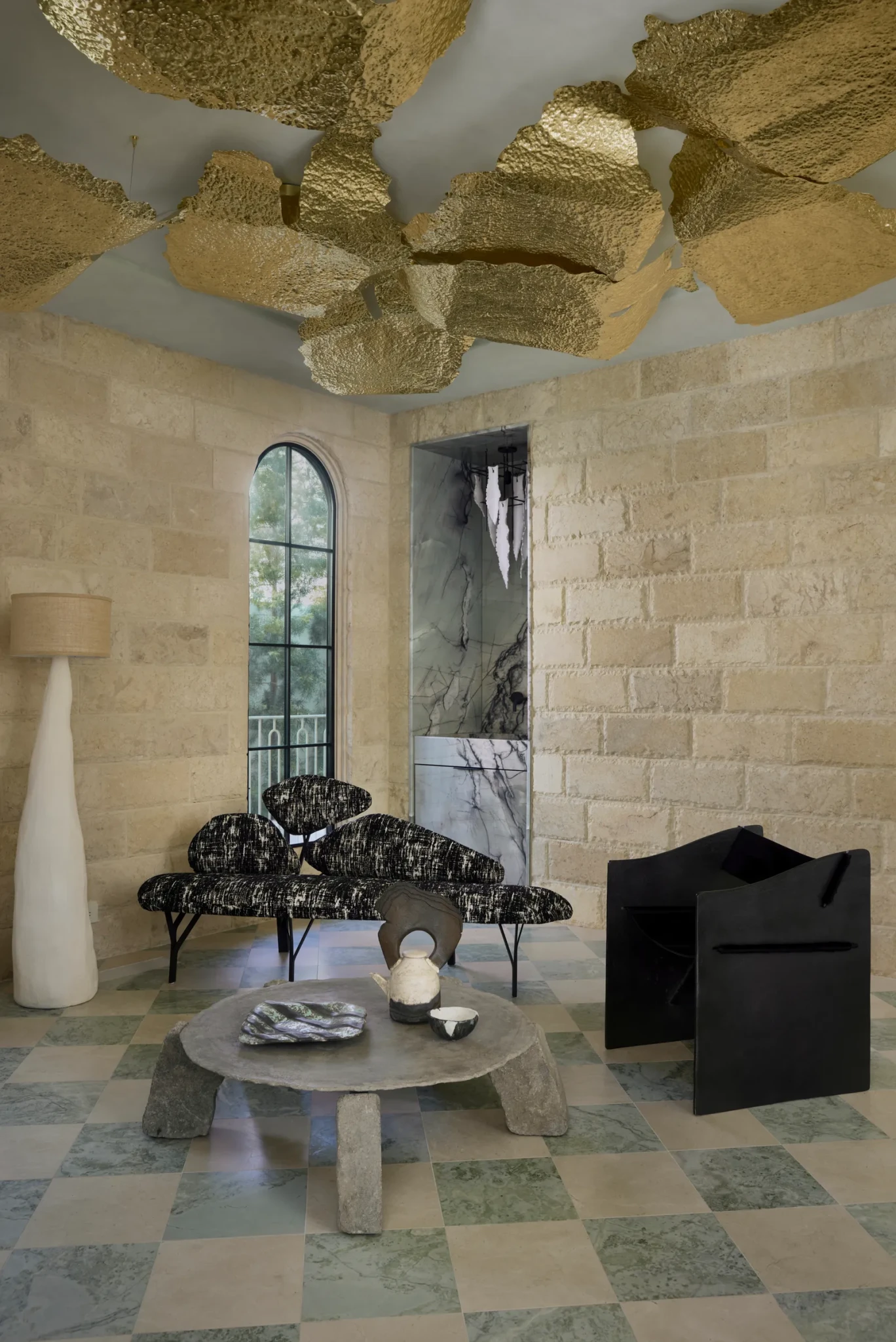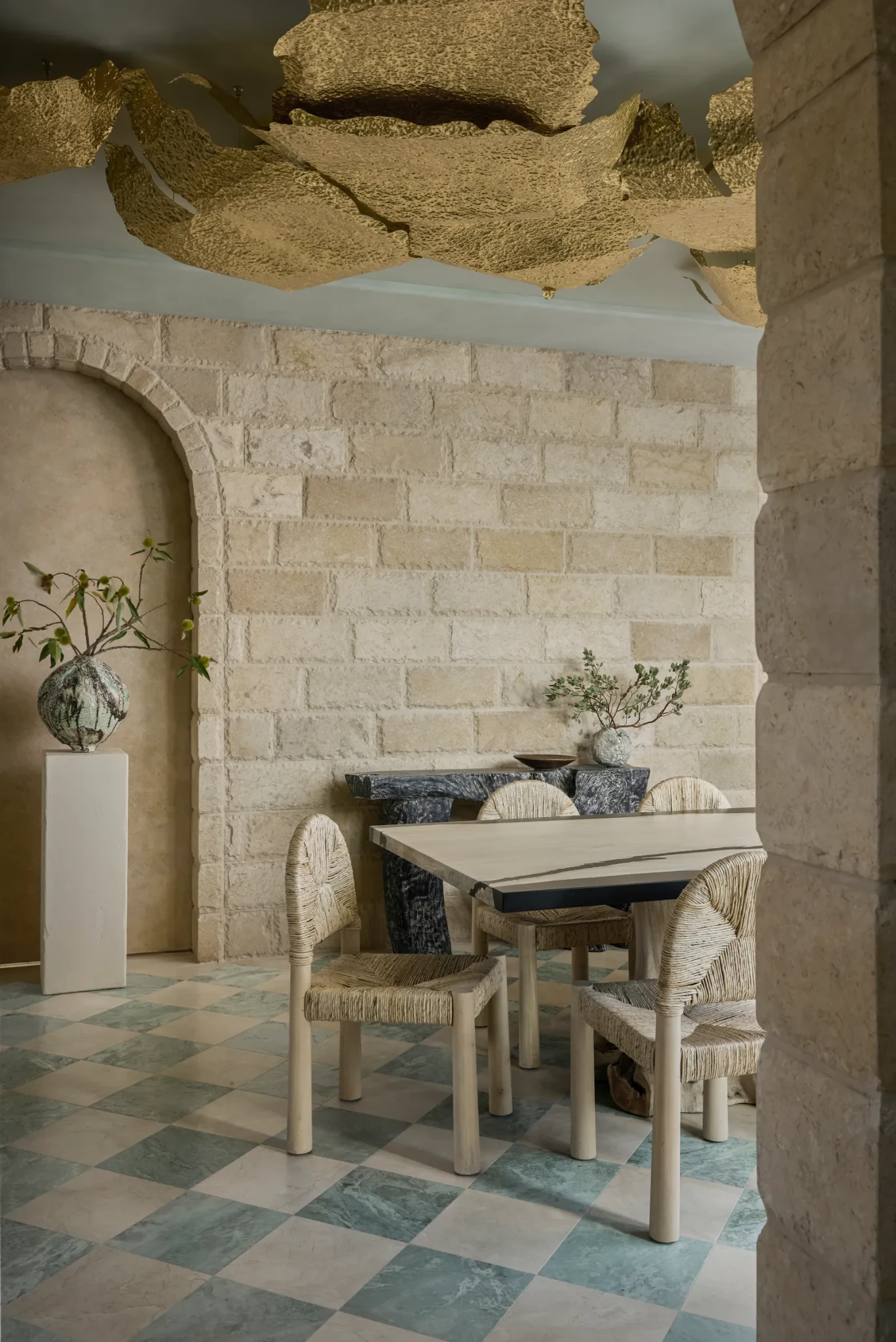 Τα υλικά κινούνται σε μια ζεστή, γήινη παλέτα, με την πέτρα, το μέταλλο, το ξύλο και τα φυσικά υφάσματα να συνδυάζονται μεταξύ τους για να δημιουργήσουν ένα layered αποτέλεσμα που εξελίσσεται καθώς αλλάζει το φως.