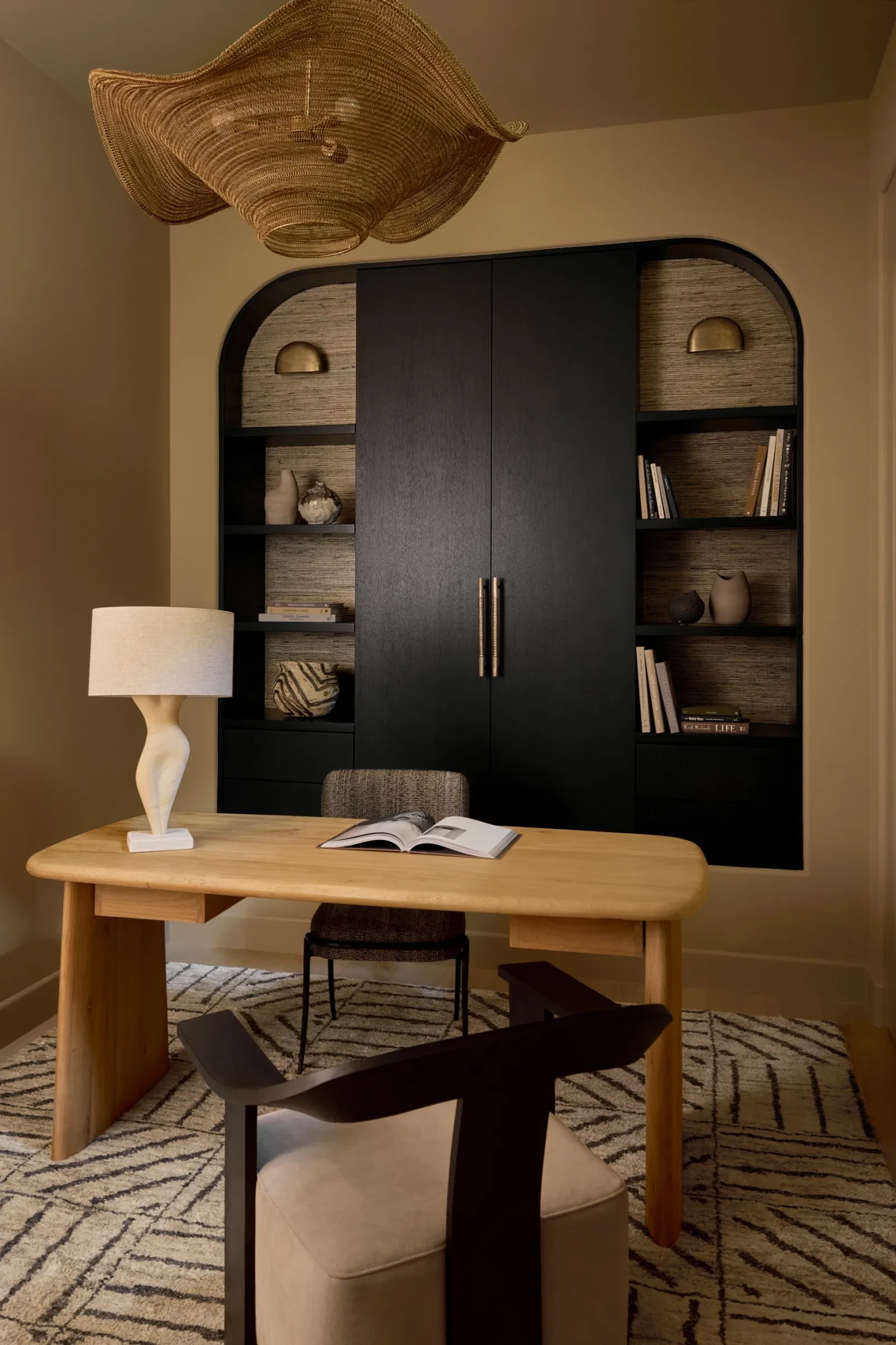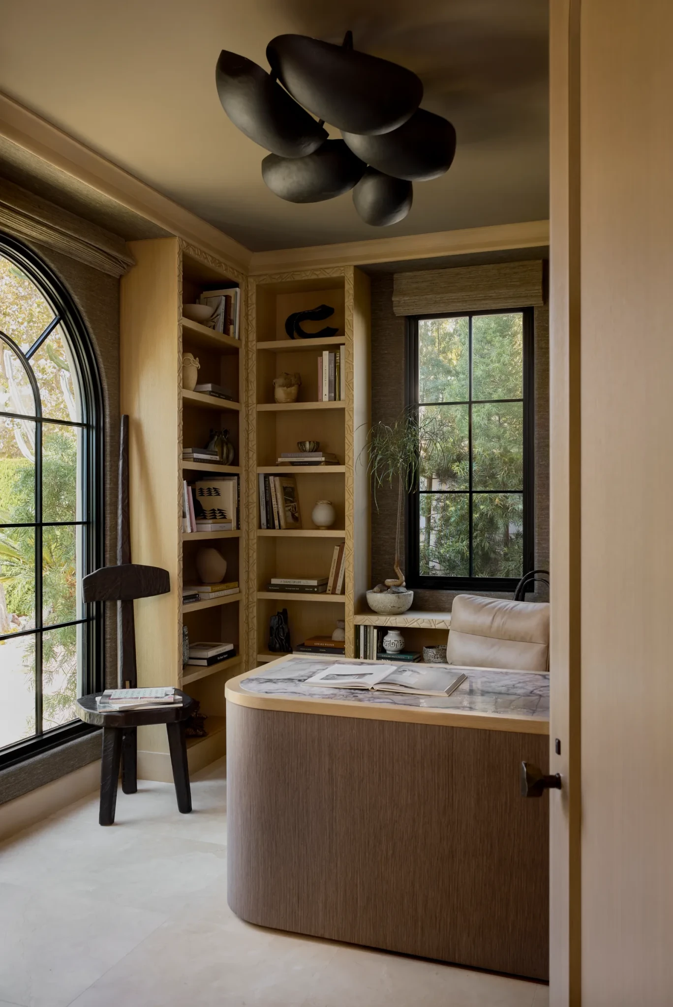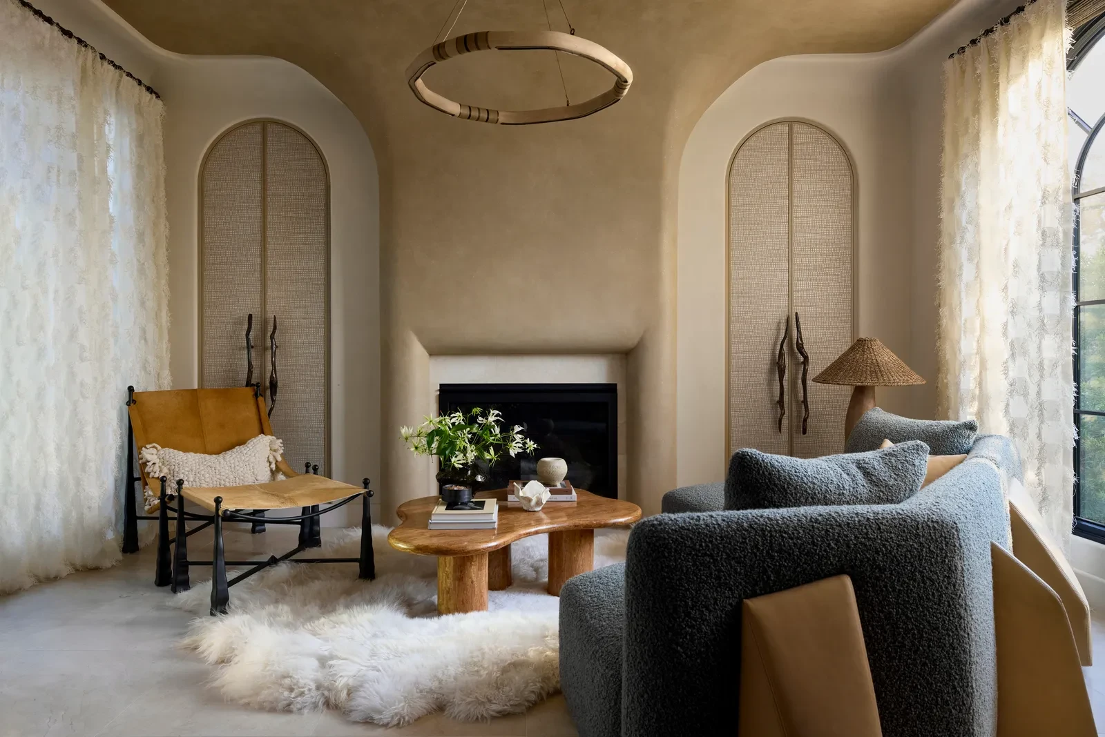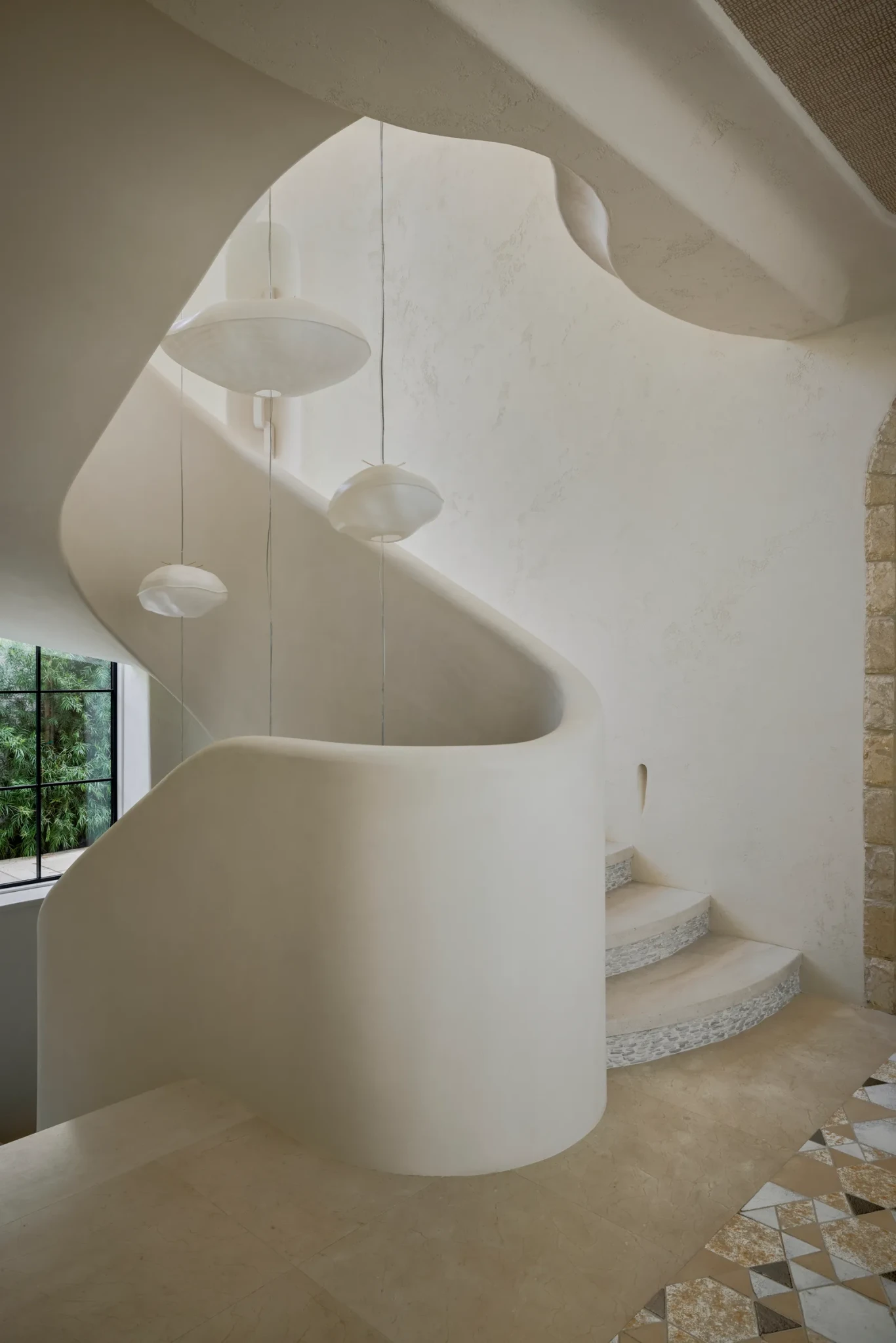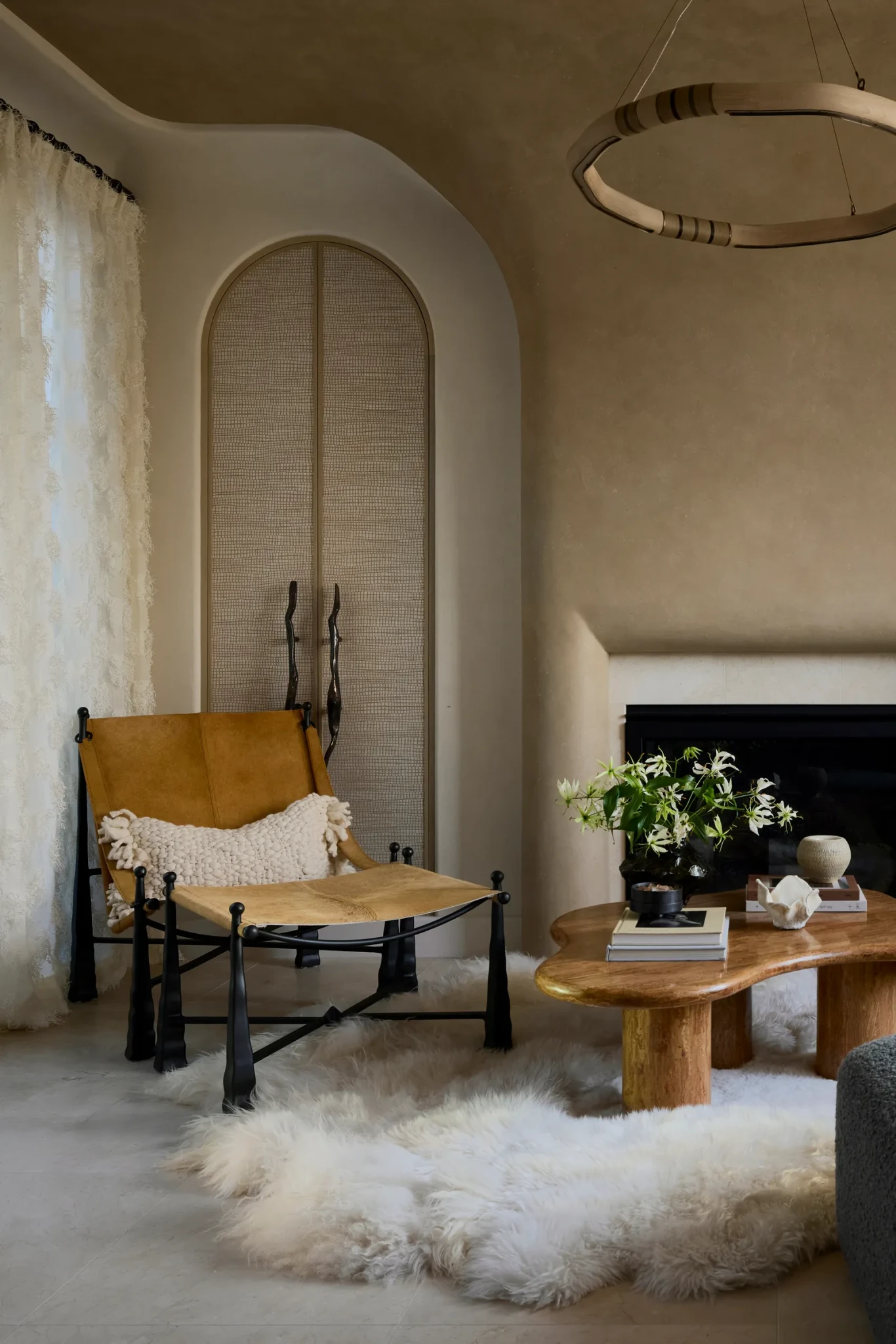 Ένα από τα πιο χαρακτηριστικά στοιχεία του σπιτιού είναι η χρήση καμπύλων γραμμών, τόσο στη δομή, όσο και στα έπιπλα. Οι χώροι δεν ορίζονται από αυστηρές γωνίες, αλλά από μια πιο οργανική ροή που ενισχύει την αίσθηση της άνεσης. Η σκάλα με το γλυπτικό κιγκλίδωμα, το τζάκι που «ανεβαίνει» μέχρι την οροφή και οι custom κατασκευές, σχεδιάστηκαν αρχικά ως σκίτσα και στη συνέχεια υλοποιήθηκαν με ακρίβεια, διατηρώντας την αίσθηση χειροποίητου design. Αυτή η προσέγγιση δημιουργεί ένα εσωτερικό που μοιάζει πιο φιλόξενο, αποφεύγοντας την αυστηρότητα που συχνά χαρακτηρίζει τα σύγχρονα σπίτια.