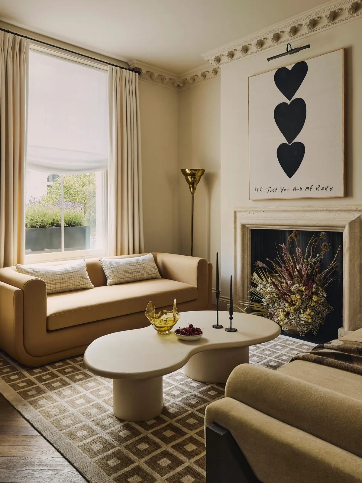Στο καθιστικό, οι καναπέδες με μαλακές γραμμές συνδυάζονται με τα χειροποίητα χαλιά και τα προσεκτικά επιλεγμένα φωτιστικά, ενώ πάνω από το τζάκι δεσπόζουν σύγχρονα έργα τέχνης. Η σύνθεση δεν είναι στατική, αλλά αποτέλεσμα ενός πετυχημένου layering, όπου κάθε στοιχείο προσθέτει βάθος. Η ισορροπία ανάμεσα στην ηρεμία της βάσης και την ένταση των λεπτομερειών δημιουργεί ένα σύνολο κομψό αλλά και φιλόξενο.