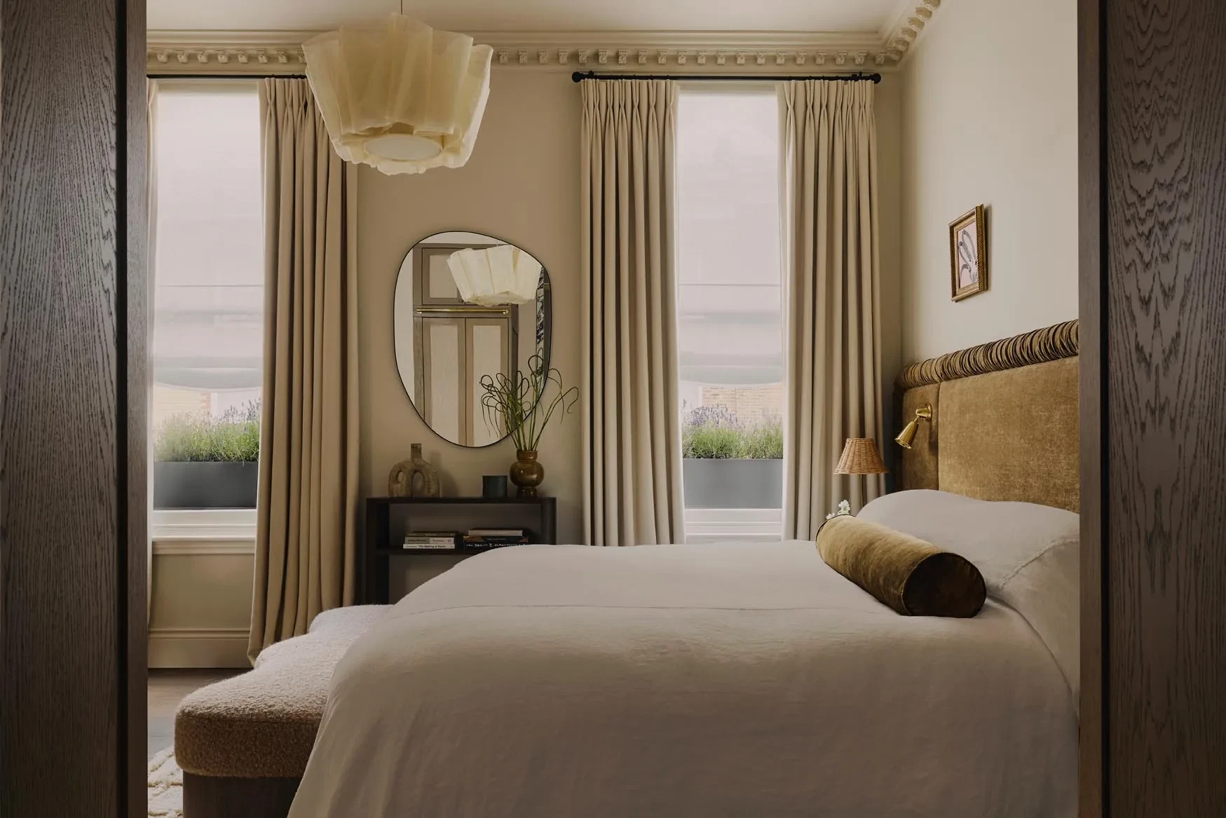 Στα υπνοδωμάτια, τα υφάσματα αποκτούν πρωταγωνιστικό ρόλο, με κεφαλάρια σε πλούσιες υφές και κουρτίνες που μαλακώνουν τη διάχυση του φωτός. Στα μπάνια, μάρμαρο και μπρούτζινες λεπτομέρειες προσθέτουν μια διακριτική πολυτέλεια στο σύνολο του χώρου. Η συνολική αισθητική δεν βασίζεται σε εντυπωσιακές κινήσεις, αλλά σε μικρές και προσεκτικά επιλεγμένες λεπτομέρειες.