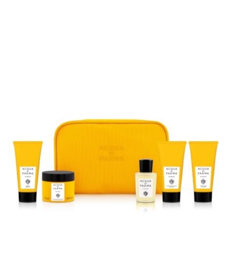 Barbiere Hair & Care gift set, Acqua di Parma: Ένα σετ απαραίτητο για τον κάθε ταξιδιώτη. Μια μοναδική επιλογή των προϊόντων από τις σειρές Colonia και Βarbiere σε πρακτική συσκευασία. Το κομψό κίτρινο υφασμάτινο τσαντάκι κατασκευασμένο από ανακυκλωμένο πλαστικό περιέχει: Colonia eau de cologne, Soft Shaving Cream, Refreshing Aftershave Emulsion, Gentle Shampoo, Medium Hold Clay. Το σετ κυκλοφορεί στην ειδική συσκευασία με το design του Κινέζου καλλιτέχνη Oamul.