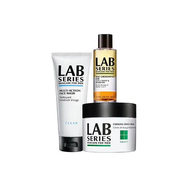 Buy hereGrooming essentials, Lab Series: Το σετ περιλαμβάνει τα Multi-Action Face Wash, Cooling Shave Cream, The Grooming Oil, όλα ιδανικά για τους άνδρες που περιποιούνται τα μούσια τους.