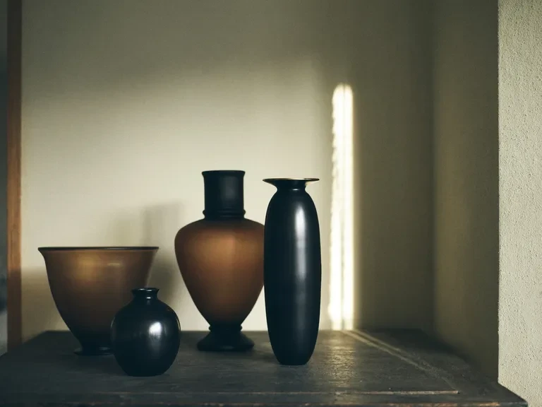 Η υλικότητα αποτελεί τον πυρήνα της συλλογής. Βάζα και φωτιστικά από ορείχαλκο και μπρούντζο συναντούν κουτιά από όνυχα και χειροποίητα φυσητά γυάλινα αγγεία με ιριδίζοντα φινιρίσματα. Πλεκτά καλάθια επιμεταλλώνονται με ασήμι, ενώ χειρολακαρισμένες επιφάνειες αναδεικνύουν την ακρίβεια και τον πλούτο παραδοσιακών τεχνικών.