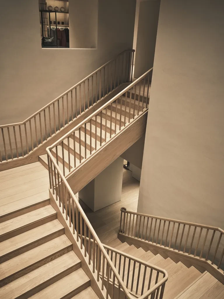 Για τη clothing σειρά και να με σκοπό να αναδειχθούν στον χώρο, ο designer δημιούργησε λεπτεπίλεπτες μεταλλικές ράγες και γυάλινες προθήκες ώστε ορισμένα κομμάτια να παρουσιάζονται με μια σχεδόν μουσειακή ευαισθησία. Τα δοκιμαστήρια έχουν σχεδιαστεί ως ήσυχα προσωπικά καταφύγια, εκεί όπου «ο ρυθμός των θυρών και των περασμάτων δημιουργεί μια αίσθηση ιδιωτικότητας, μετατρέποντας τη δοκιμή ρούχων σε προσωπικό ritual». To προσεκτικά μελετημένο μουσικό χαλί αλλά και η απομόνωση των εξωτερικών ήχων, τα απαλά υφάσματα και η απουσία οπτικού θορύβου ενισχύουν περαιτέρω την αίσθηση γαλήνης που επικρατεί στην boutique της Βαρκελώνης.
