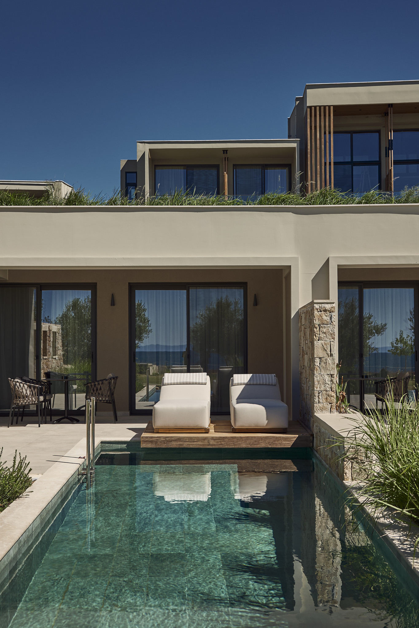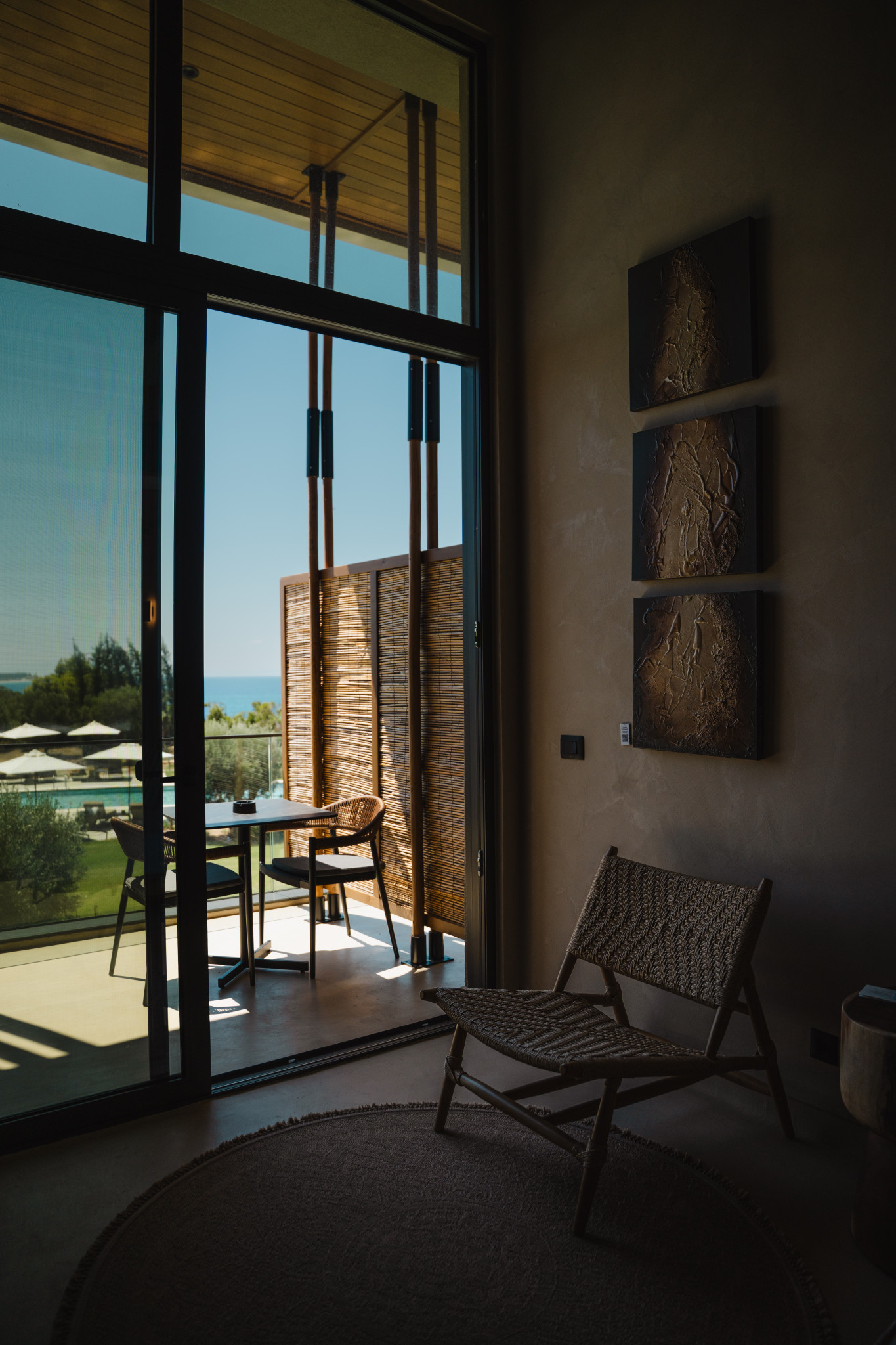 Η αρχιτεκτονική του, με boho-luxe γραμμές και φυσικά υλικά, συνδυάζει τη μινιμαλιστική καθαρότητα του σύγχρονου design με τη ζεστασιά της Μεσογείου -ξύλο, πέτρα, γήινες υφές και απαλό φως δημιουργούν μια ατμόσφαιρα αυθεντικής αρμονίας. Οι σουίτες και τα δωμάτια, εμπνευσμένα από τη φύση που τα περιβάλλει, ξεχωρίζουν για την κομψότητα και την ηρεμία τους, με γήινες αποχρώσεις, προσεγμένες λεπτομέρειες και πολυτέλεια. Από τις ιδιωτικές πισίνες και τις swim-up terraces μέχρι τη μαγευτική θέα στο Αιγαίο, κάθε χώρος προσφέρει μια μοναδική εμπειρία άνεσης και κομψότητας, επαναπροσδιορίζοντας την έννοια της φιλοξενίας.