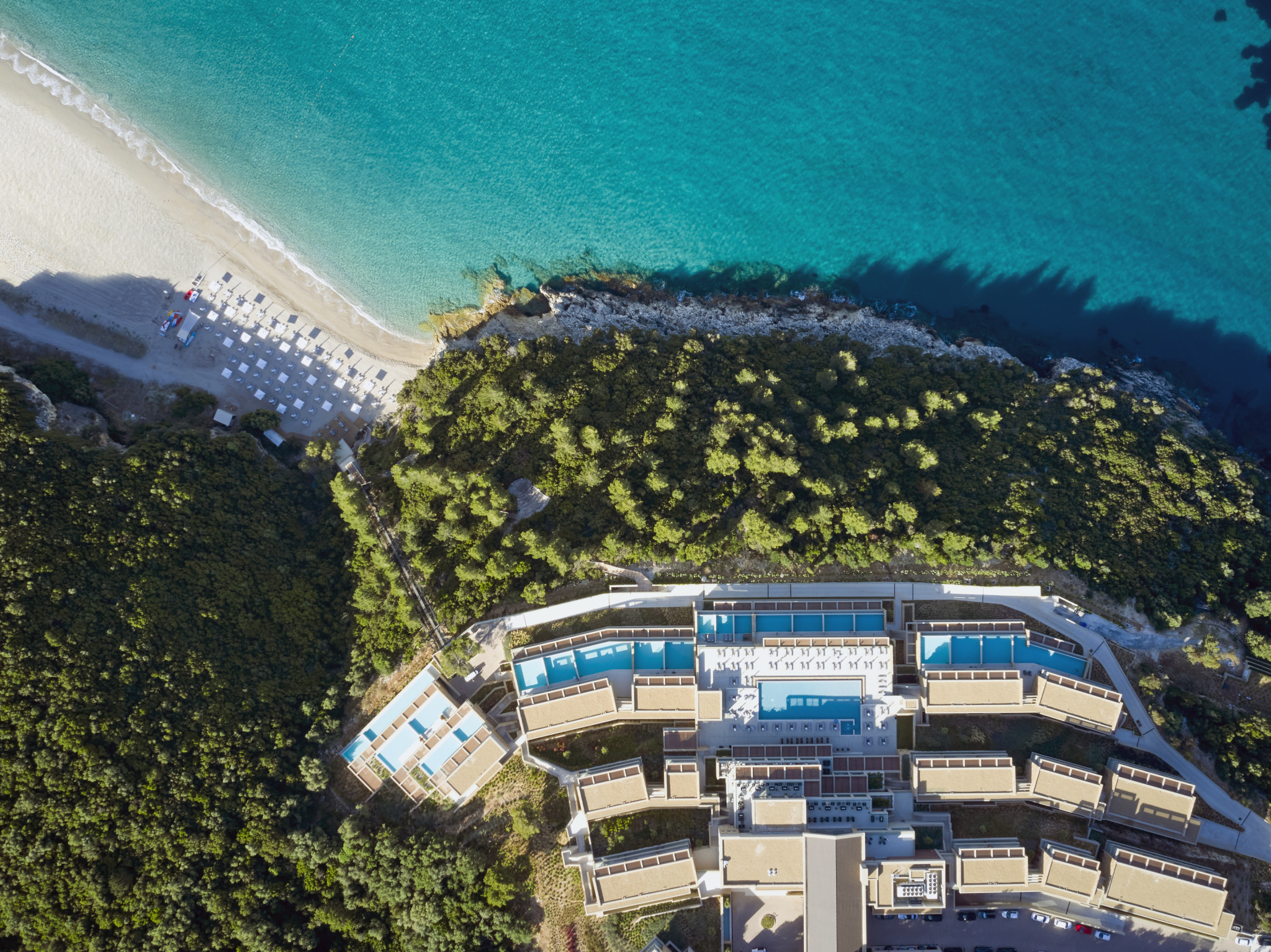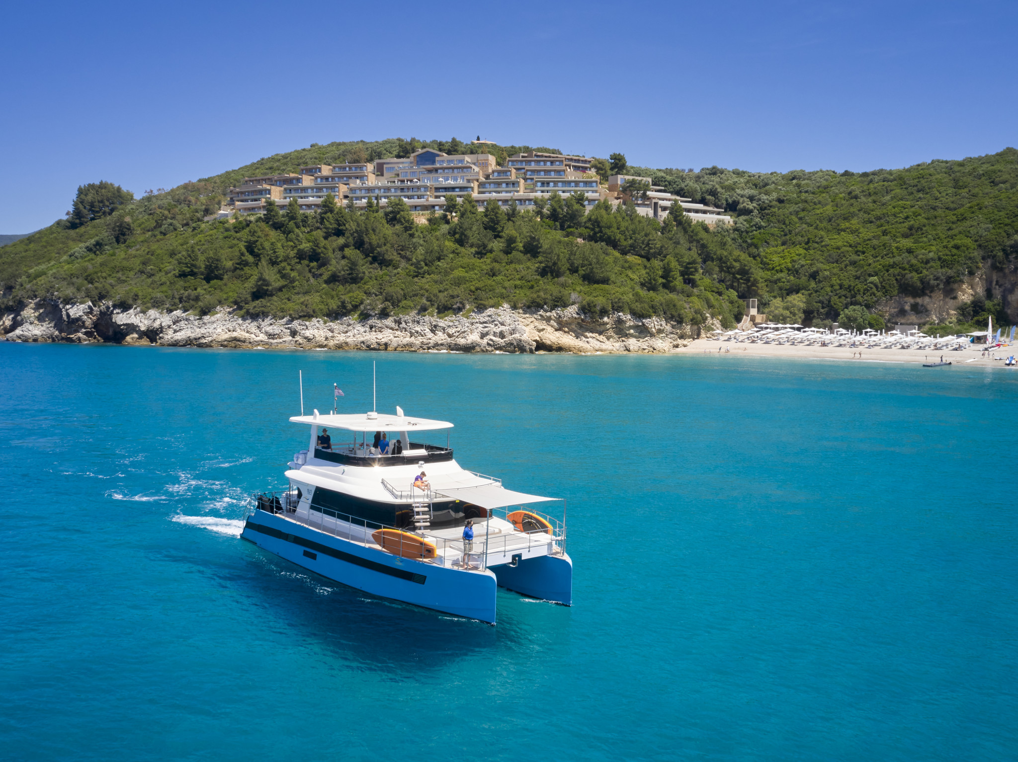 Η άμεση σχέση με τη θάλασσα αποτελεί βασικό στοιχείο της ταυτότητας του ξενοδοχείου. Η παραλία Καραβοστάσι, προσβάσιμη είτε μέσω ιδιωτικού τελεφερίκ είτε μέσα από ένα καταπράσινο μονοπάτι, διατηρεί έναν χαρακτήρα σχεδόν ανέγγιχτο. Παράλληλα, οι εγκαταστάσεις του ξενοδοχείου -από την κεντρική εξωτερική πισίνα με jacuzzi μέχρι τους πιο ήσυχους, σκιερούς χώρους για οικογένειες- ενισχύουν την αίσθηση ότι το νερό βρίσκεται παντού, ως στοιχείο χαλάρωσης αλλά και δραστηριότητας.